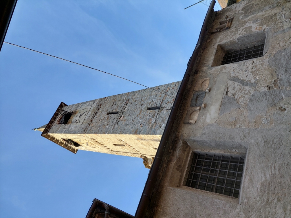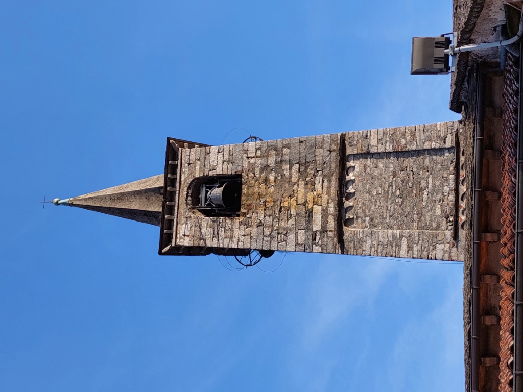 Campanile: alle spalle della chiesa, romanico della chiesa del 1100, restaurato nel '600 con l'aggiunta della guglia e della cella campanaria |