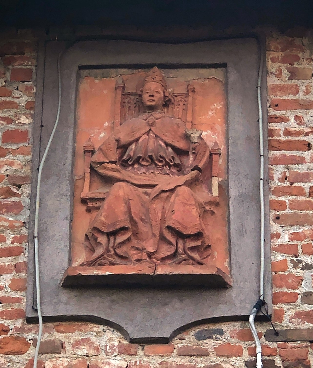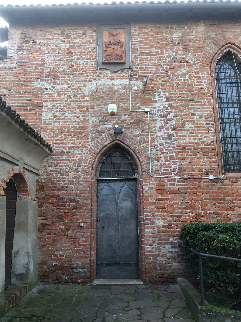 Esterno: portale del fianco settentrionale ornato da un rilievo quattrocentesco in terracotta. |