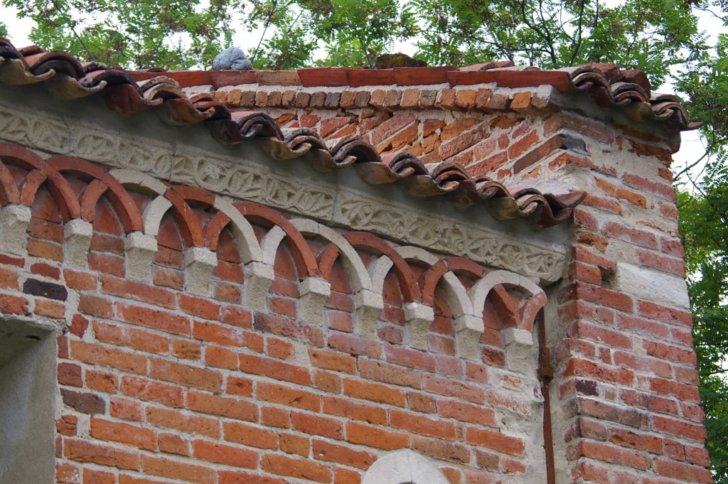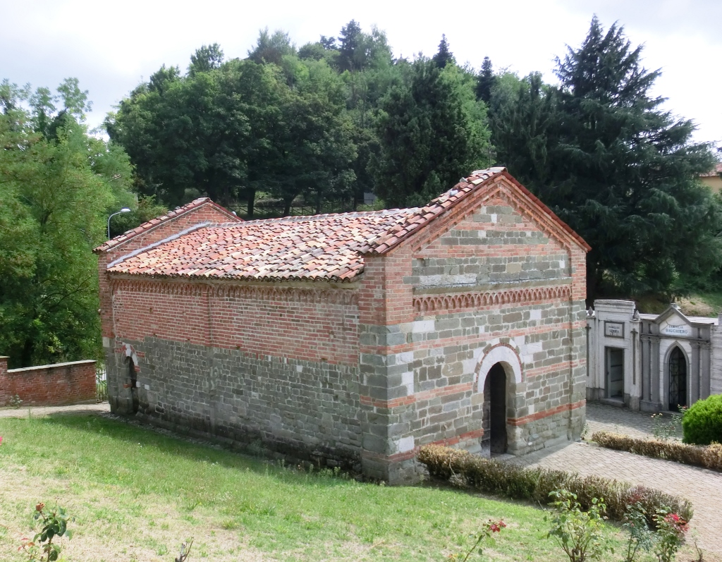 Esterno: Si presenta a pianta rettangolare e abside semicircolare, con copertura a due falde, con una muratura inferiore a grossi blocchi lapidei e superiore in mattoni. L'abside è coronata da un fregio ad archetti pensili intrecciati in tufo, sostenuti da mensoline lavorate a svariati motivi. Il fregio è sormontato da una cimasa scolpita con motivo ad intreccio vimineo. I tre campi in cui l'abside è suddivisa da due sottili colonnine sormontate da capitelli cubici, sono aperti ciascuno da una finestrella ad arco, quella a nord conserva un frammento di grata lapidea. Le pareti laterali denotano un netto cambiamento di tecnica costruttiva tra la parte bassa in pietra e la parte alta in mattoni, anch'essa coronata da un fregio ad archetti pensili intrecciati e probabilmente dovuta a una più tarda ricostruzione. Nel timpano absidale di mattoni si apre una finestrella a forma di croce. La facciata, che probabilmente ricalca la originaria, è frutto di un restauro dell'800 secondo lo stile del romanico astigiano (arco a sesto rialzato con ghiera di mattoni disposti a dente di sega e fascia di mattoni alternati ad arenaria). |