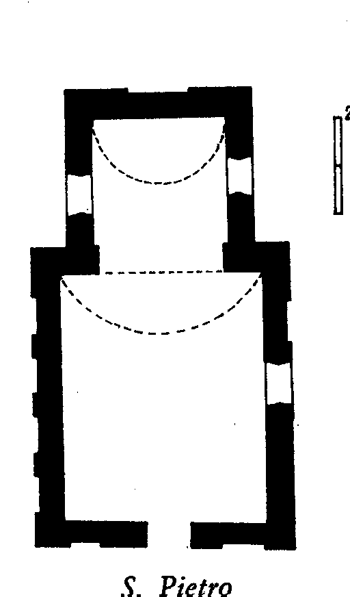 Esterno: abside quadrata e facciata scandita da tre grandi arcature poste secondo l'inclinazione del tetto secondo un motivo in uso sin dal V secolo; due arcature si trovano sul fianco meridionale; una su ciascun lato dell'abside; sul fianco Nord vi sono quattro vere e proprie nicchie dal profilo rettangolare. |
