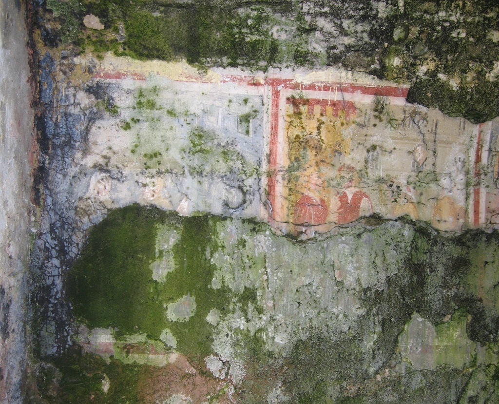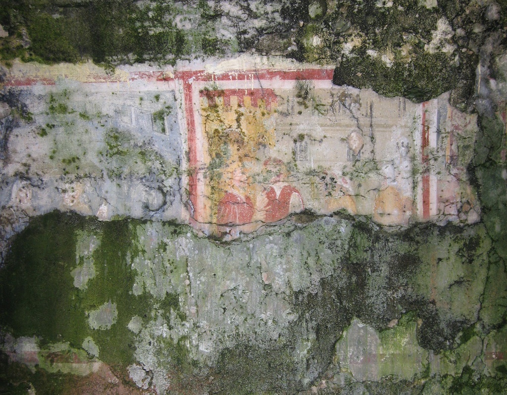 Interno: La cappella è divisa in due parti, entrambe con un solo piano, costruite in epoche differenti, perché diverse per caratteristiche architettoniche e tipologiche: la prima di epoca medievale, con murature molto spesse e una volta ad ogiva realizzata in pietra; e l’altra, databile intorno al 1800, che presenta murature più sottili, due volte a botte con diverse altezze, una delle quali presenta due unghie, ed un semicatino absidale con costoloni, che lo dividono in tre parti, ognuna delle quali ha un’unghia. La pianta è poligonale, dotata di asse di simmetria; il pavimento è ovunque in pietra e presenta tre diversi livelli di calpestio: partendo dal portone d’ingresso, il livello è circa 10 cm più alto rispetto al terreno esterno, poi in corrispondenza della soglia della porta interna (che permette l’accesso alla seconda cella), vi è un ulteriore innalzamento di circa 15 cm ed infine il terzo lo troviamo nella zona absidale che è rialzata di 7 cm. Entrambe le celle risultano avere pareti perimetrali affrescate: su quelle della prima sono presenti affreschi rappresentanti scene di vita quotidiana, caratterizzati da elementi di notevole pregio, segno della loro importanza e qualità; mentre su quelle della seconda le decorazioni sono motivi geometrici. Le pareti del “portico” anteriore sono annerite dal fumo di mille bivacchi ed intaccate dall’umidità, ma, fino a qualche anno fa, era ancora possibile vedere gran parte di quegli affreschi, non databili precisamente ma fatti risalire al XVI secolo, che, probabilmente, raffiguravano immagini di pellegrini in marcia sotto le mura merlate di una città. Un’altra ipotesi che è stata fatta riguarda l’autore di tali raffigurazioni, che potrebbe essere lo stesso che affrescò la parete della chiesa di San Giacomo a Bagnasco. Fonte: tesi di Katia Odasso - 2011 |