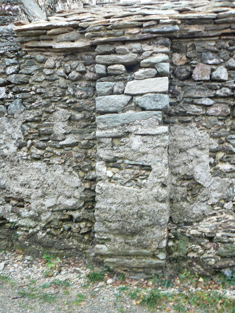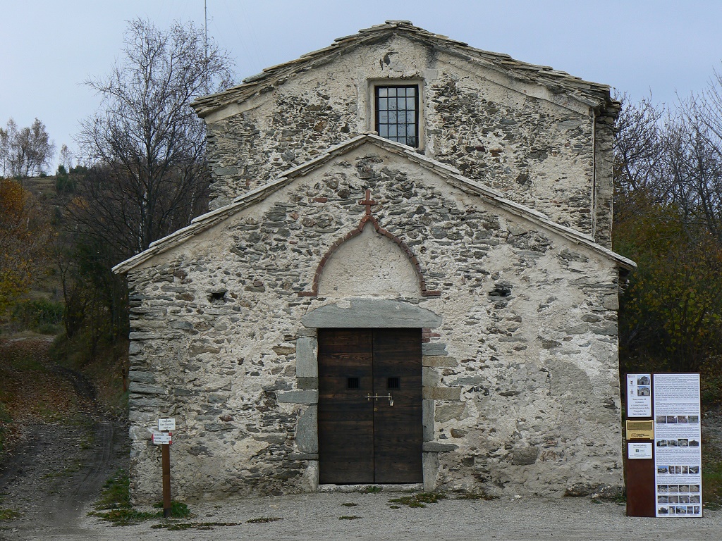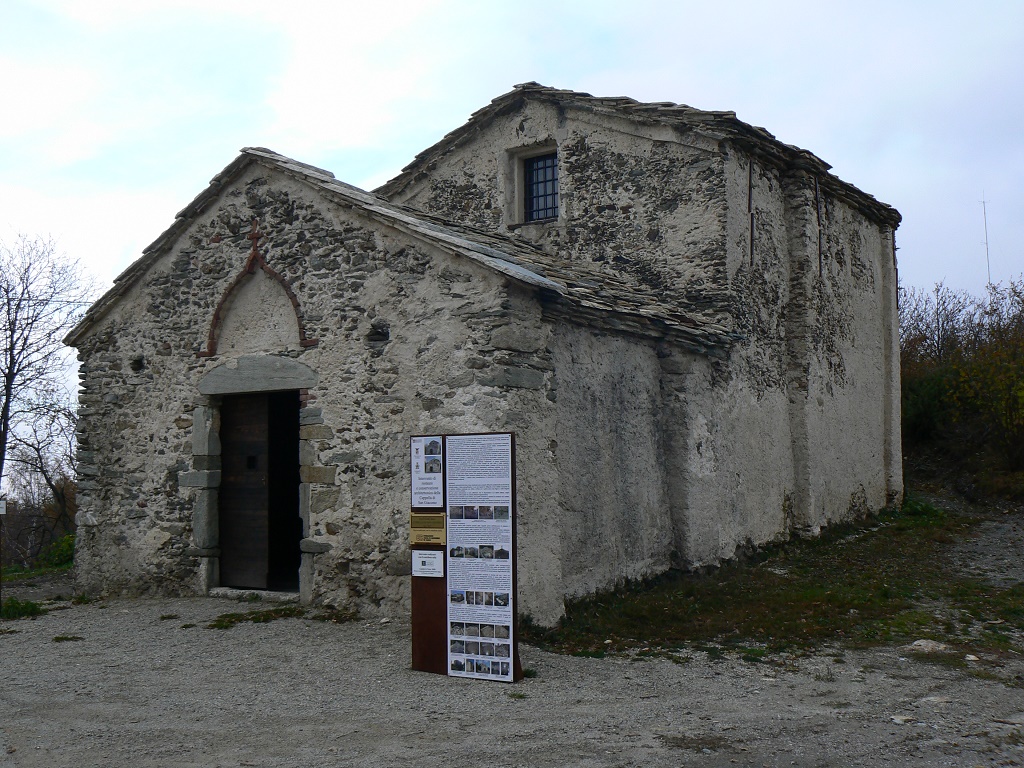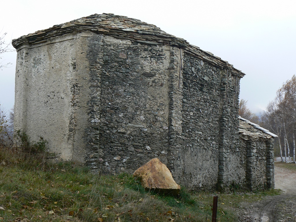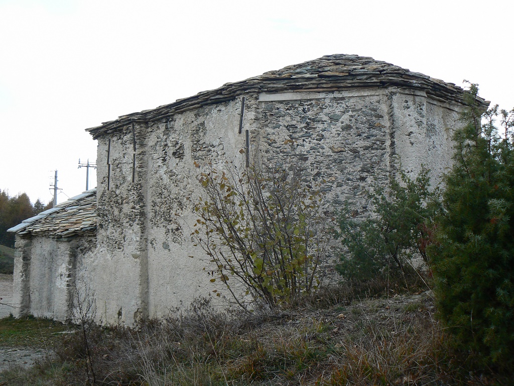 Esterno: La muratura è portante, in pietra faccia a vista di varie pezzature ed alcuni mattoni, con giunti in malta di fango. Sulla facciata principale e su quella rivolta a sud è presente anche uno strato di intonaco. La struttura esterna ha un ritmo pressoché regolare che gli viene dato dalle lesene, poste su tutto in perimetro. Il tetto, su entrambe le parti è a due falde ed il manto di copertura è in lastre di pietra (lose). Nella zona absidale si è trovata una traccia di decorazione, che fa presupporre che la cappella, in passato fosse decorata anche esternamente. Fonte: tesi di Katia Odasso - 2011 |