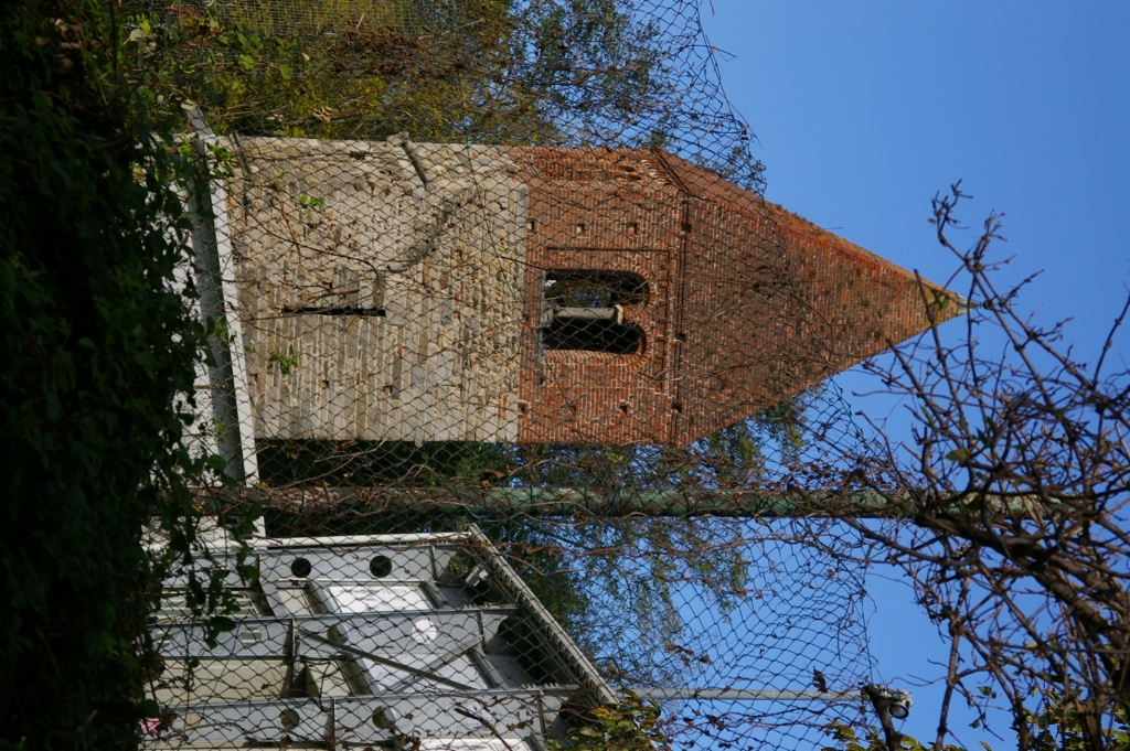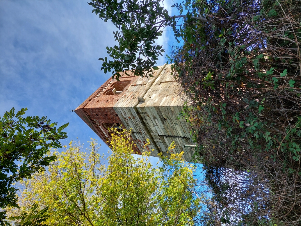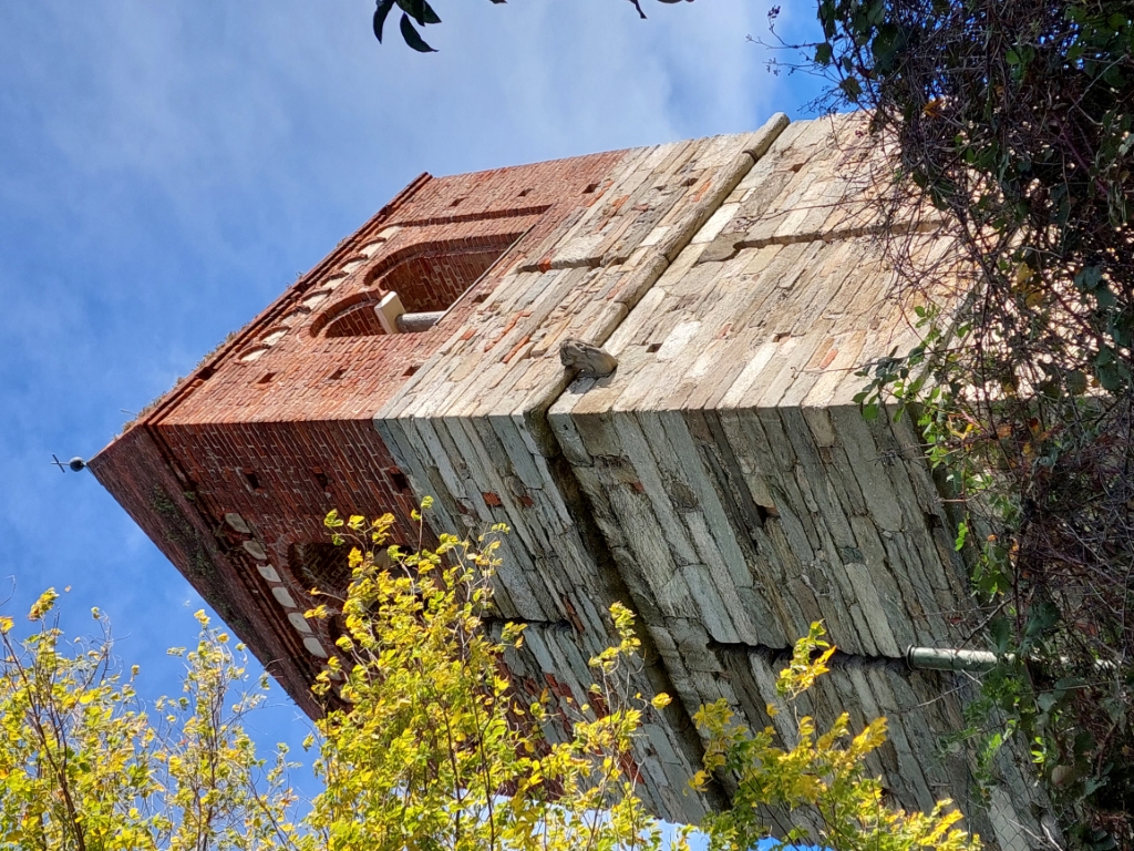 Campanile: unica parte superstite della chiesa dell'XI secolo. Si innalza su un basamento di pietra grigia con strette feritoie e decorazioni geometriche di pietra e mattoni. Cella campanaria con quadruplice coppia di bifore. Cuspide quadrangolare in mattoni. |