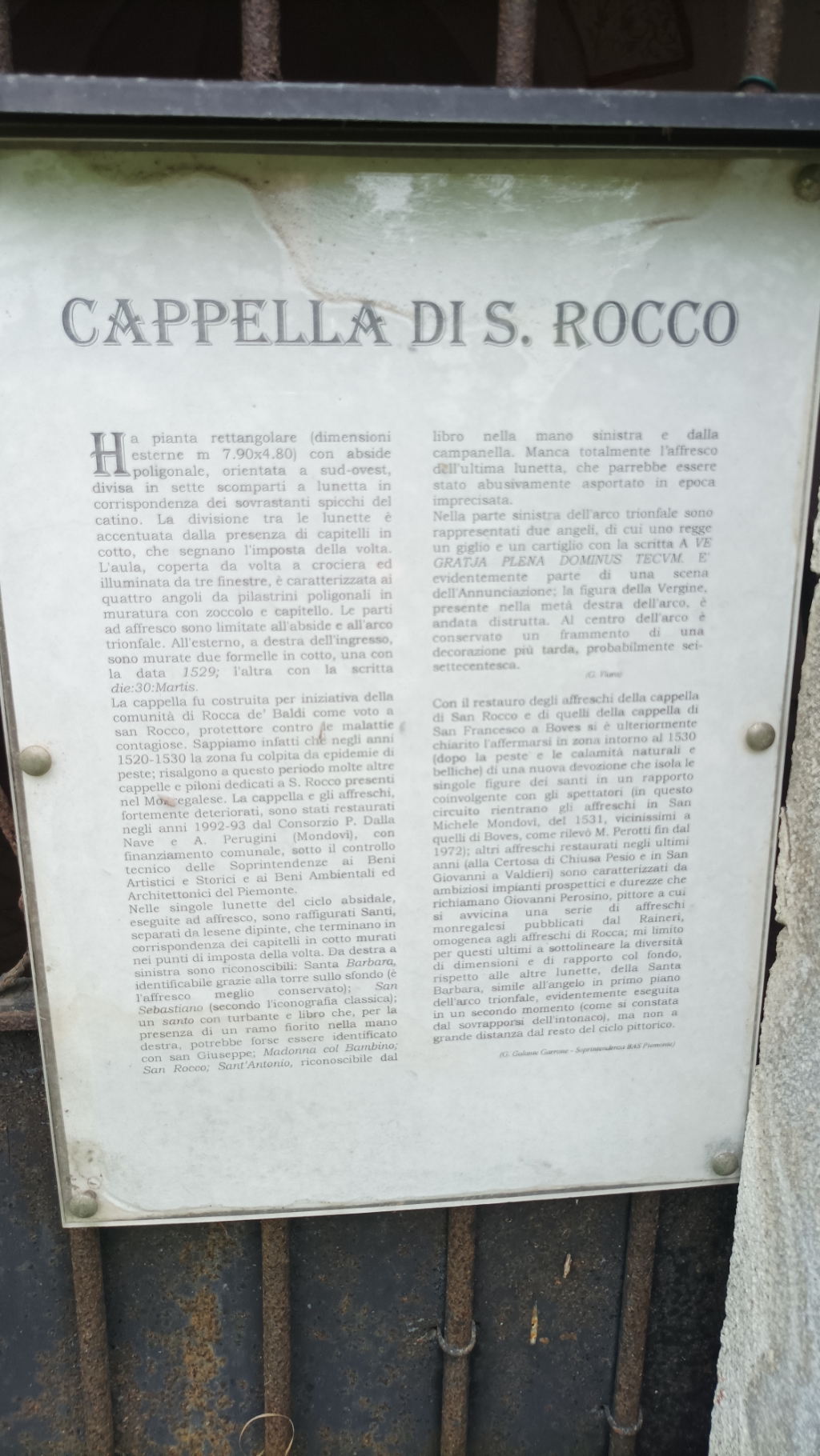 La Cappella si trova a Rocca De' Baldi (CN), nota come San Rocco. Periodo prevalente: XVI secolo. Livello di interesse: 1 (Interessante). Elementi presenti: architettura, pittura. Da vedere: esterno, interno.