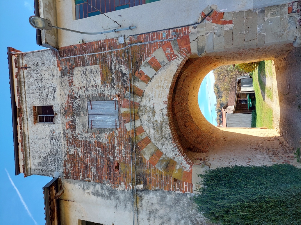 porta d’ingresso fortificata, turrita con un grande arco ogivale bianco e rosso con mattoni alternati ad arenaria. |
