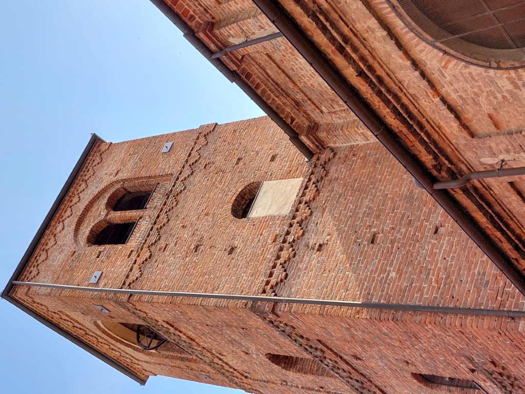 Campanile: in mattoni, inferiormente romanico, superiormente del '300 con finestre ad arco acuto e cornici in cotto. |