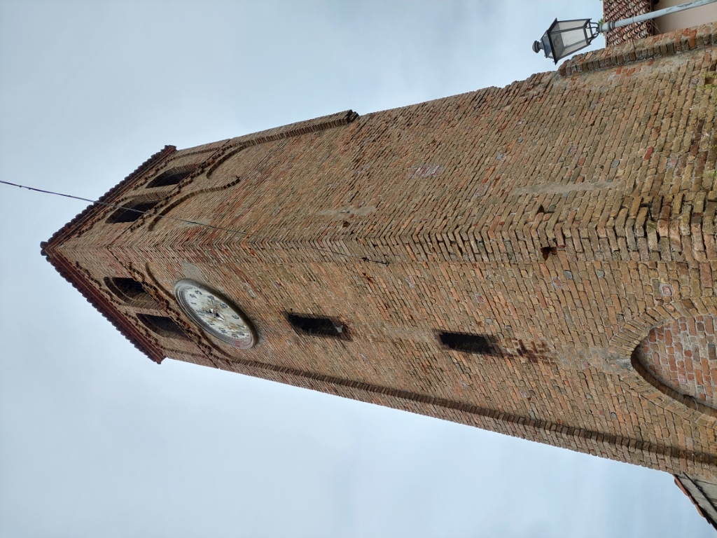Campanile: del '200 in mattoni con fregi in cotto, staccato dalla chiesa, a circa 100 metri, in Via Carlo Alberto. |