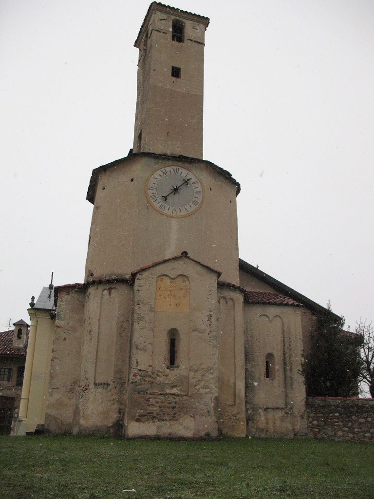 Notizie generali: risalente al tardo X secolo - inizio XI, si presenta a pianta centrale ottagonale con lati di diversa lunghezza sui quali si aprono otto absidi a sezione rettangolare o semicircolare. La profondità irregolare delle nicchie permette la formazione di una base a croce greca. Sovrasta la base un tiburio di stile lombardo e una volta emisferica. La pianta ha analogia con il battistero di Lomello (PV) e la struttura muraria lo accomuna a quello di San Lorenzo a Settimo Vittone (TO). Il campanile sulla cupola è di epoca barocca. |