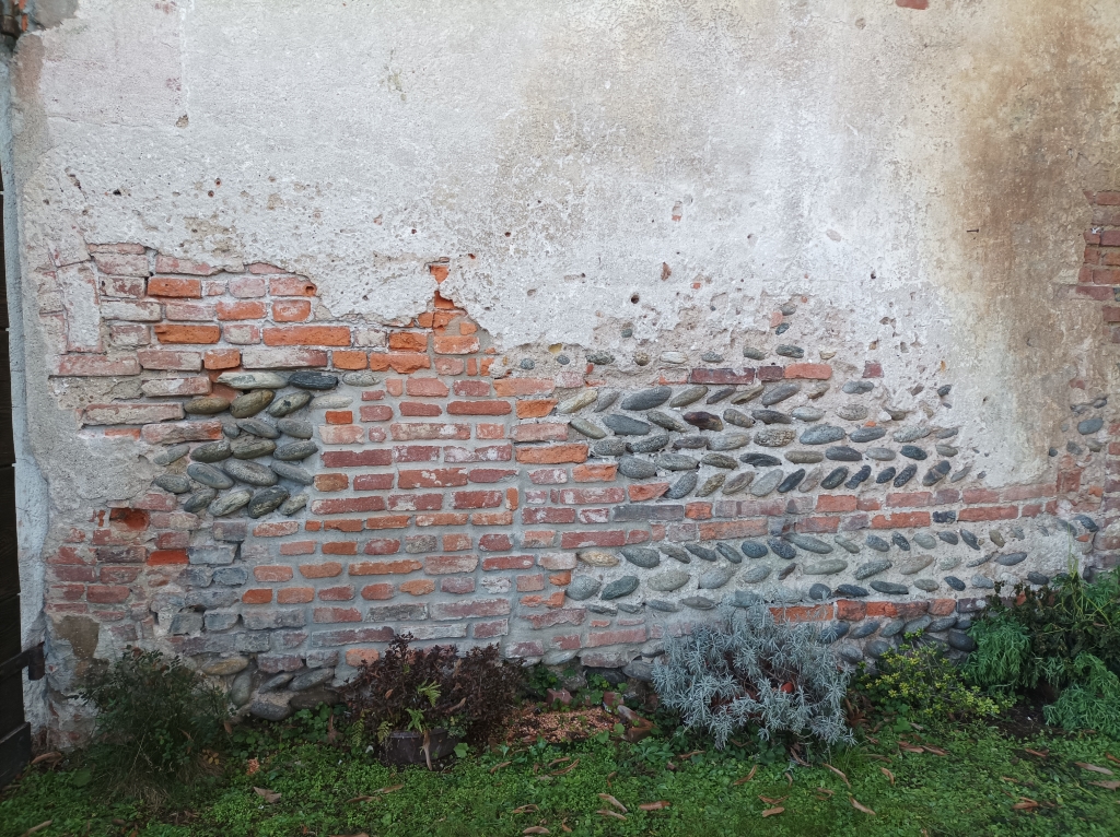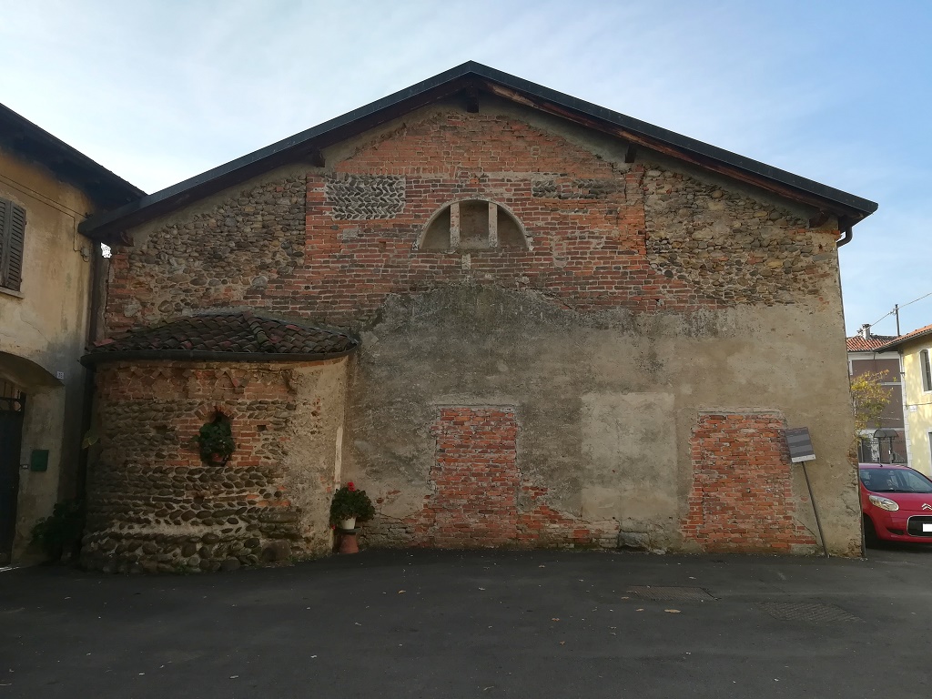 Esterno: resti dell'abside originale e tracce di muratura in ciottoli a lisca di pesce |