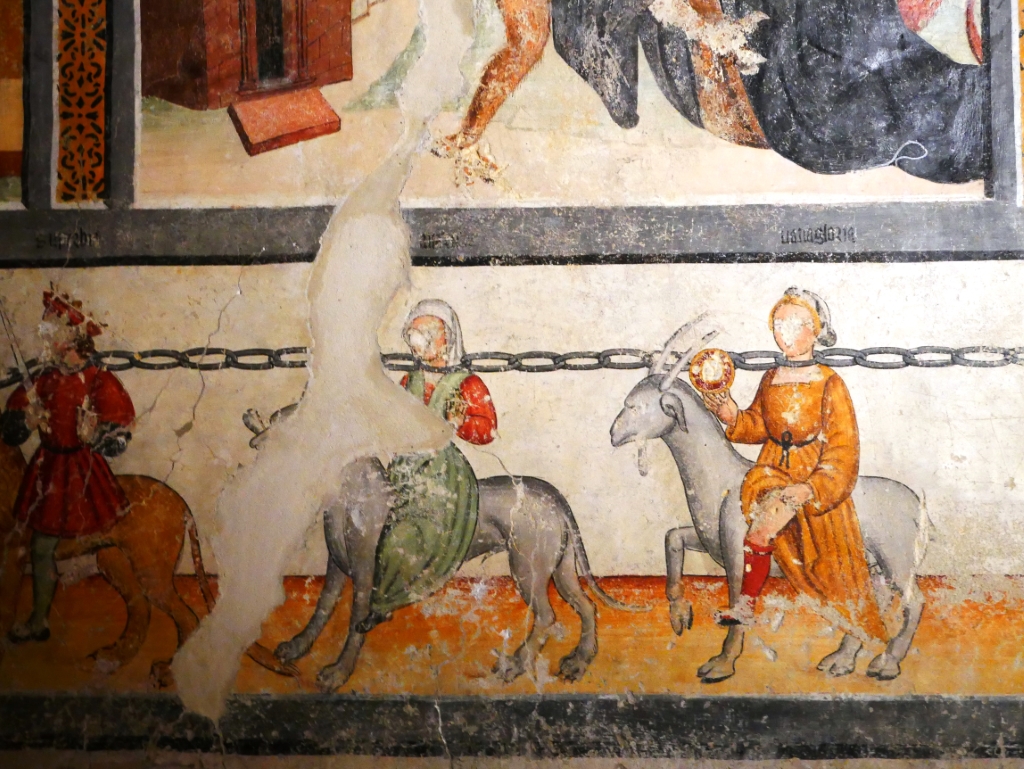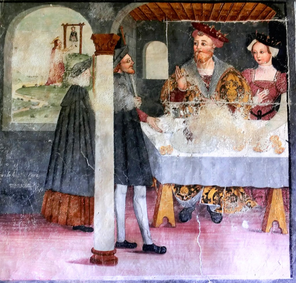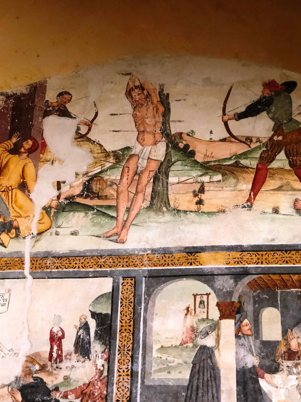 Esterno: sotto il portico affreschi della Cavalcata dei Vizi con le figure allegoriche che cavalcano ciascuna un animale che rappresenta il vizio corrispondente; sempre sotto il portico affresco del Miracolo di San Giacomo, avvenuto a Santo Domingo de La Calzada in Spagna con le figure del governatore di Santo Domingo e della moglie di particolare bellezza; tale affresco potrebbe essere dovuto al transito di pellegrini sulla via di Santiago de Compostela. Entrambe gli affreschi sono databili metà del '500. |