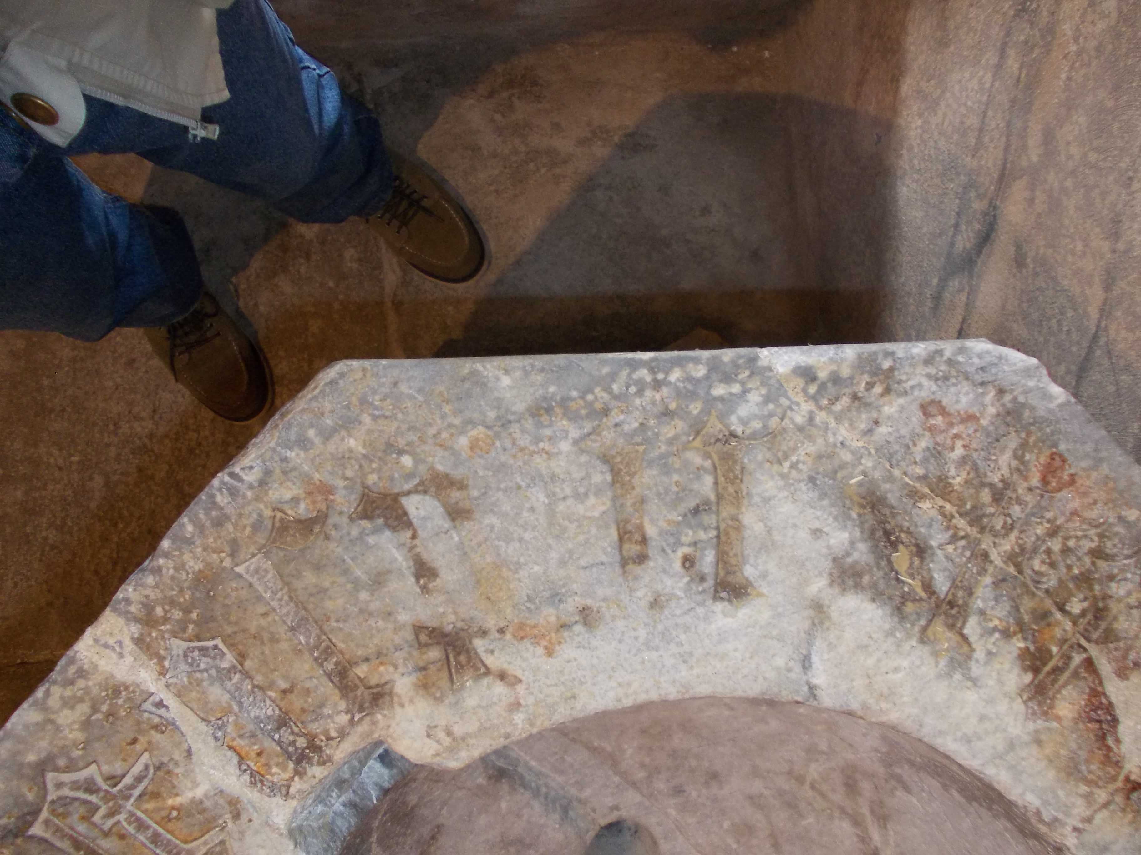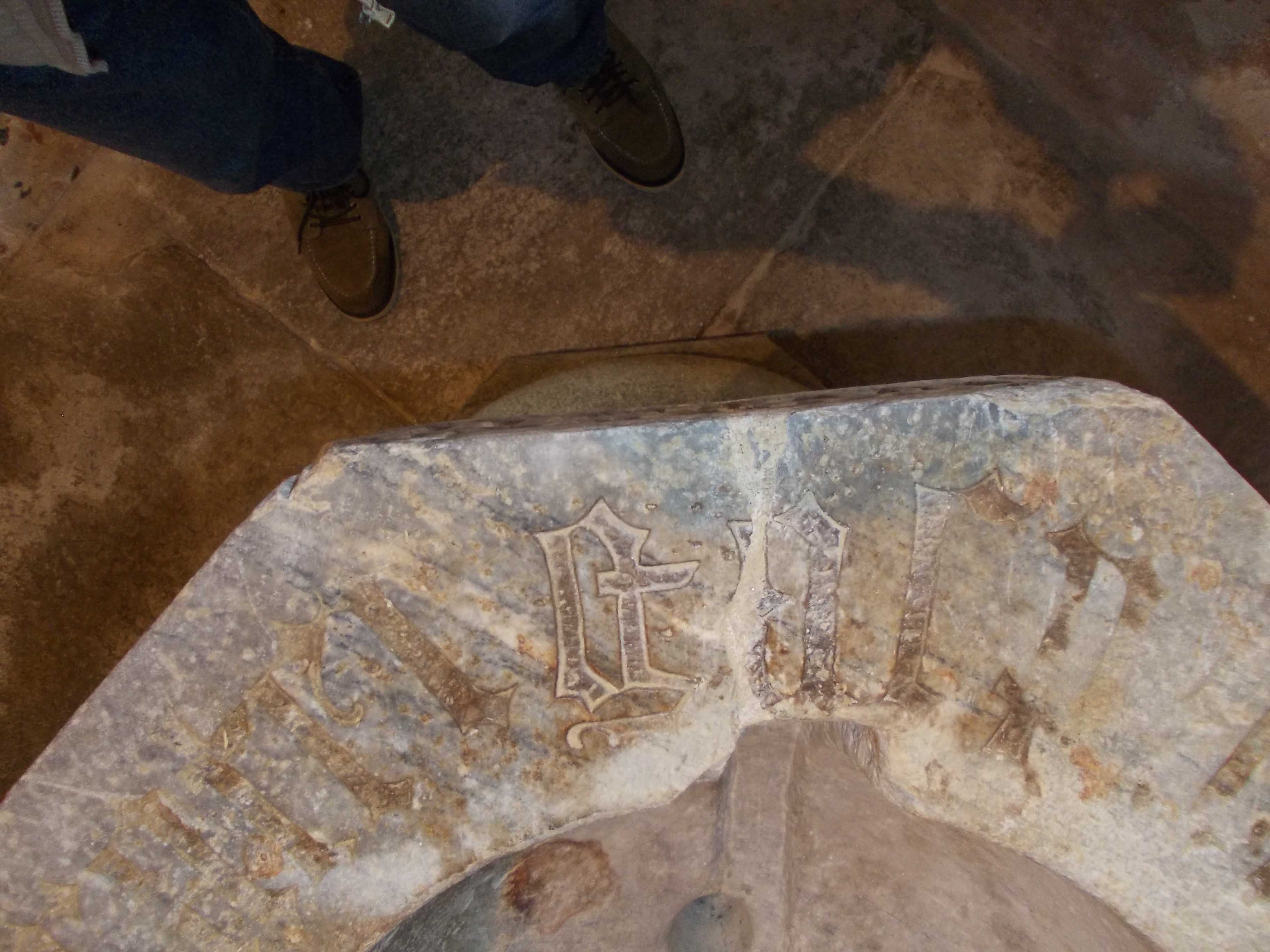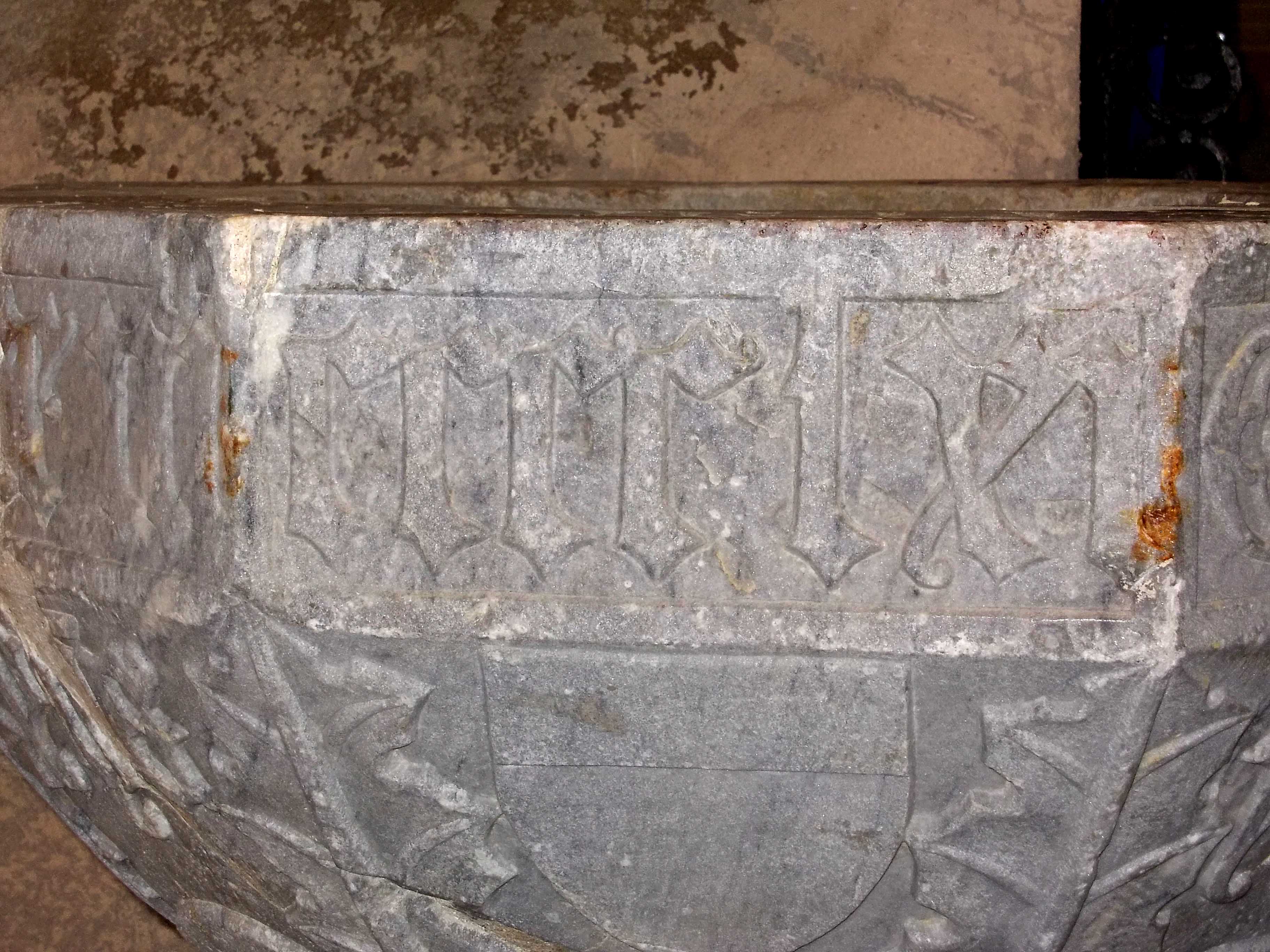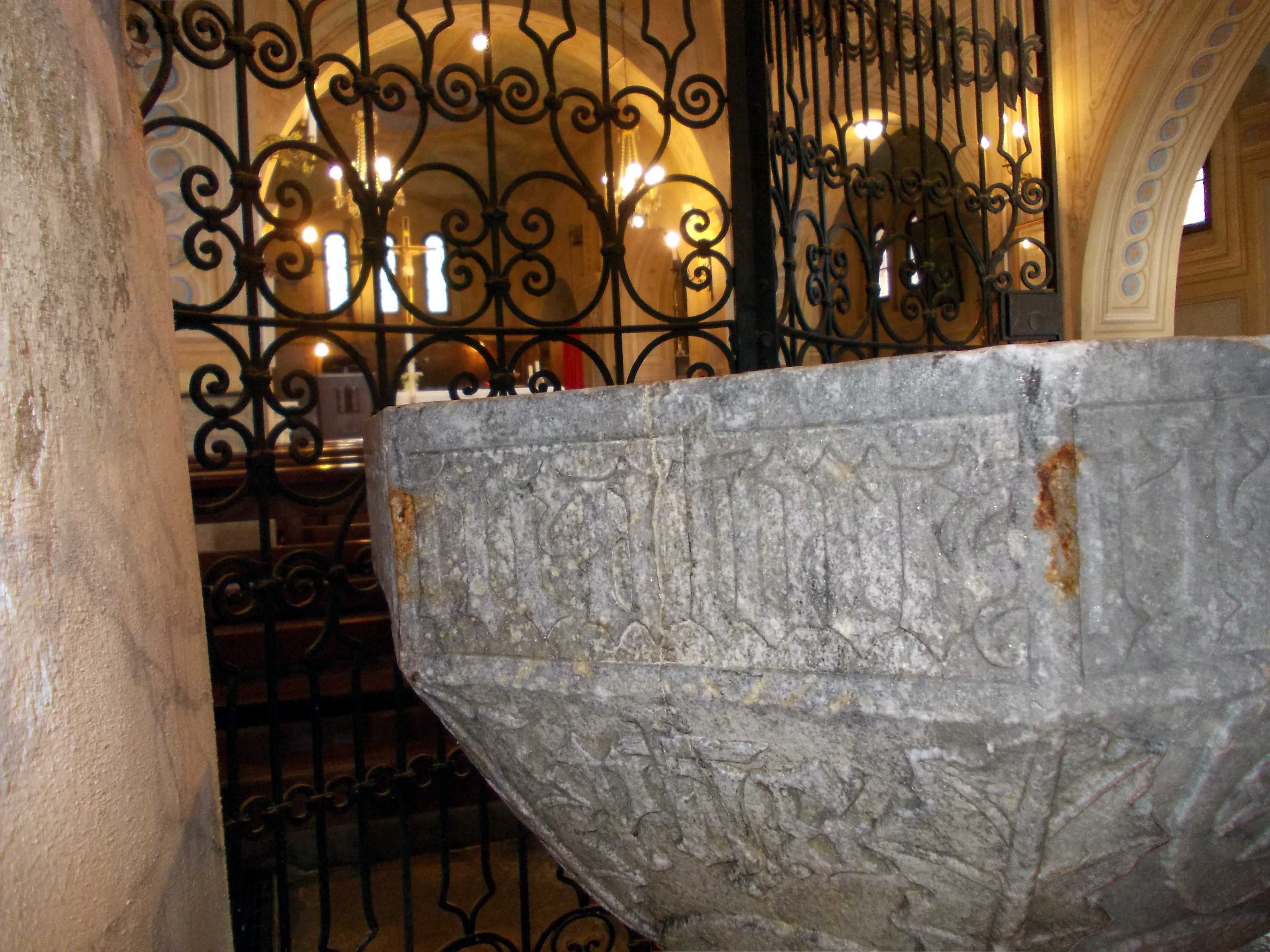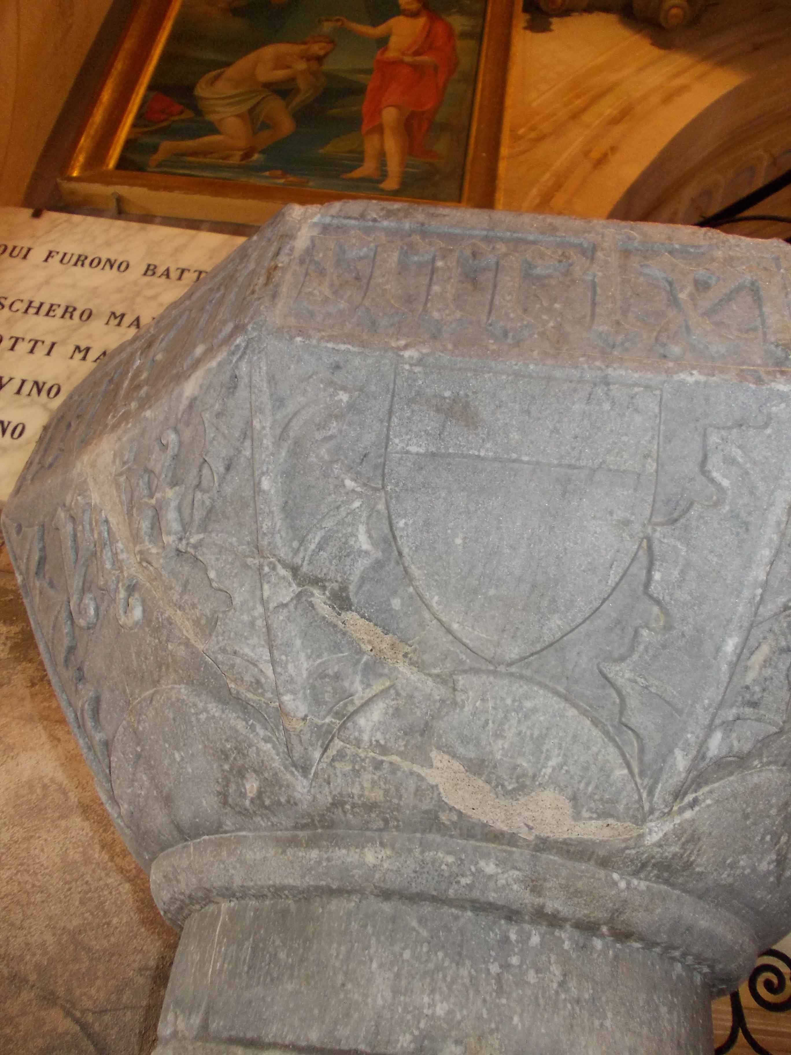 fonte battesimale del '400 della scuola degli Zabreri con stemma dei Marchesi di Saluzzo e dei Piossasco. |