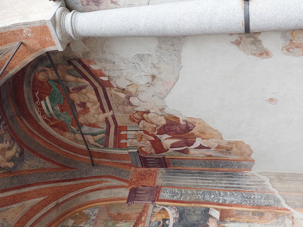 Esterno: in facciata, nella lunetta Adorazione del Bambino (1517) e a sinistra Natività di Gaudenzio Ferrari (1477-1546); a destra Transito di Maria; al di sopra del portale Assunta, Apostoli e un angelo che porge il singolo a San Tommaso attribuiti a Andrea Solario (prima 1473-dopo 1520); nella fronte Creazione dell'uomo, Peccato originale e cacciata dal paradiso; nella volta sopra il portale Paradiso e la corona preparata per Maria, Purgatorio e inferno; nel lato destro Sposalizio di stile affine a quello di Giulio Cesare Luini. |