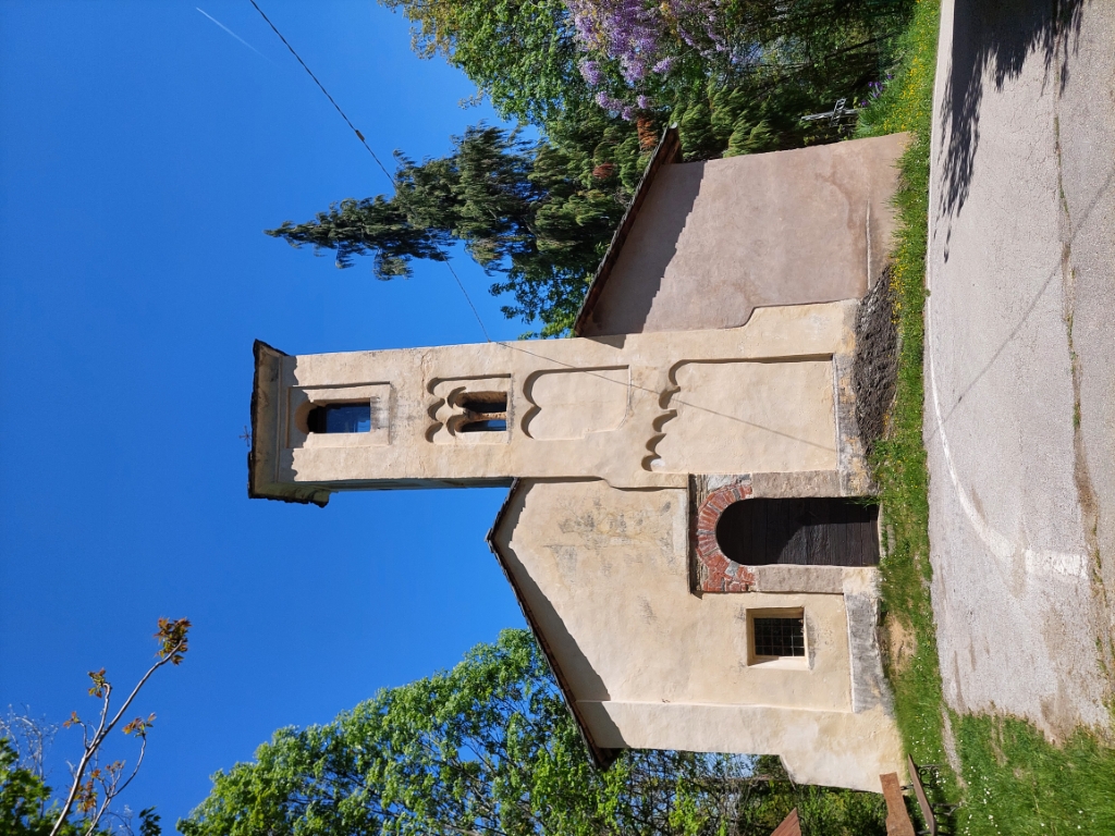 romanico, in facciata, rimaneggiato nel '900 con il tamponamento delle bifore e trifore. e l'aggiunta della cella campanaria. |