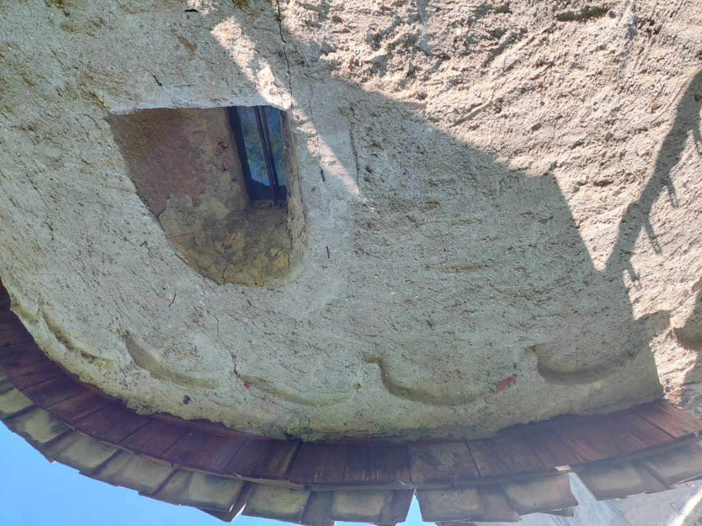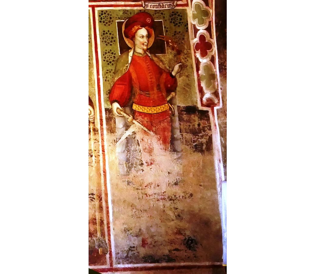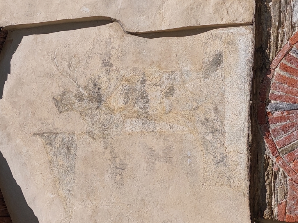 Esterno: tracce di affreschi del '400 in facciata e archetti romanici. |