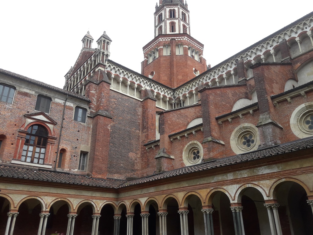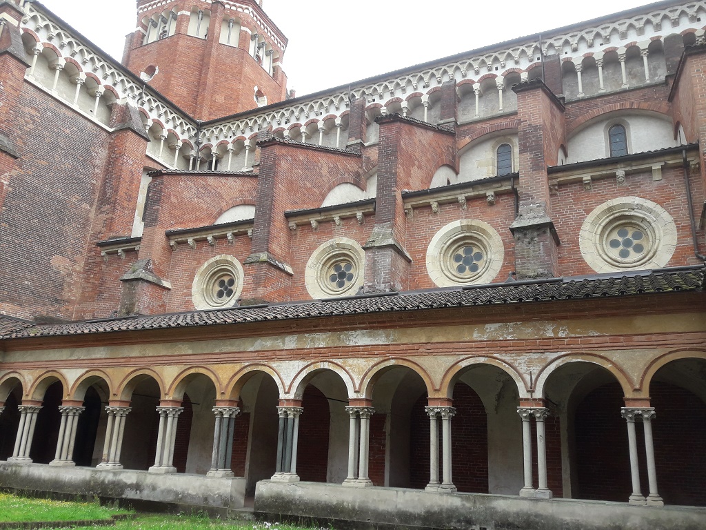 Interno: chiostro a pianta rettangolare con arcate a tutto sesto rette da fasci di quattro colonne romaniche, coperto da volte a vela girate nel 1519 quando fu aggiunta la cornice di cotto all'esterno; al centro il pozzo con il parapetto originario. Lungo il lato sinistro vi era il refettorio, segnalato all'esterno da due arcate rette da una mensola entro cui era inserto il lavabo. Dal fondo del chiostro, per un portale ornato da una lunetta tardo gotica con scolpito il Redentore, si passa alla chiesa. Dal chiostra si passa per un portale fiancheggiato da due bifore alla sala capitolare a pianta quadrata, coperta da volte a costoloni rette da quattro colonne centrali, vi si conserva un affresco della Madonna col Bambino e dei Putti musicanti attribuiti alla scuola del Lanino o di Gaudenzio Ferrari. Dalla sala capitolare si passa alla Sagrestia dove, nella lunetta della porta che introduce alla scala a chiocciola che introduce al convento, si trova una statua della Madonna della seconda metà del 200, in stile gotico con influssi francesi. Sempre dal chiostro si accede al parlatorio con volte sorrette da una colonna centrale. |
