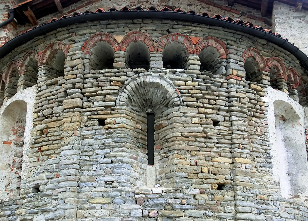 Esterno: archetti pensili del IX secolo; abside dell'XI e porticato del '400. Sulla facciata sotto il portico affreschi attribuiti a Rufino di Alessandria del 1413-1414 rappresentanti la Madonna col Bambino, Sant'Antonio Abate e San Rocco. |