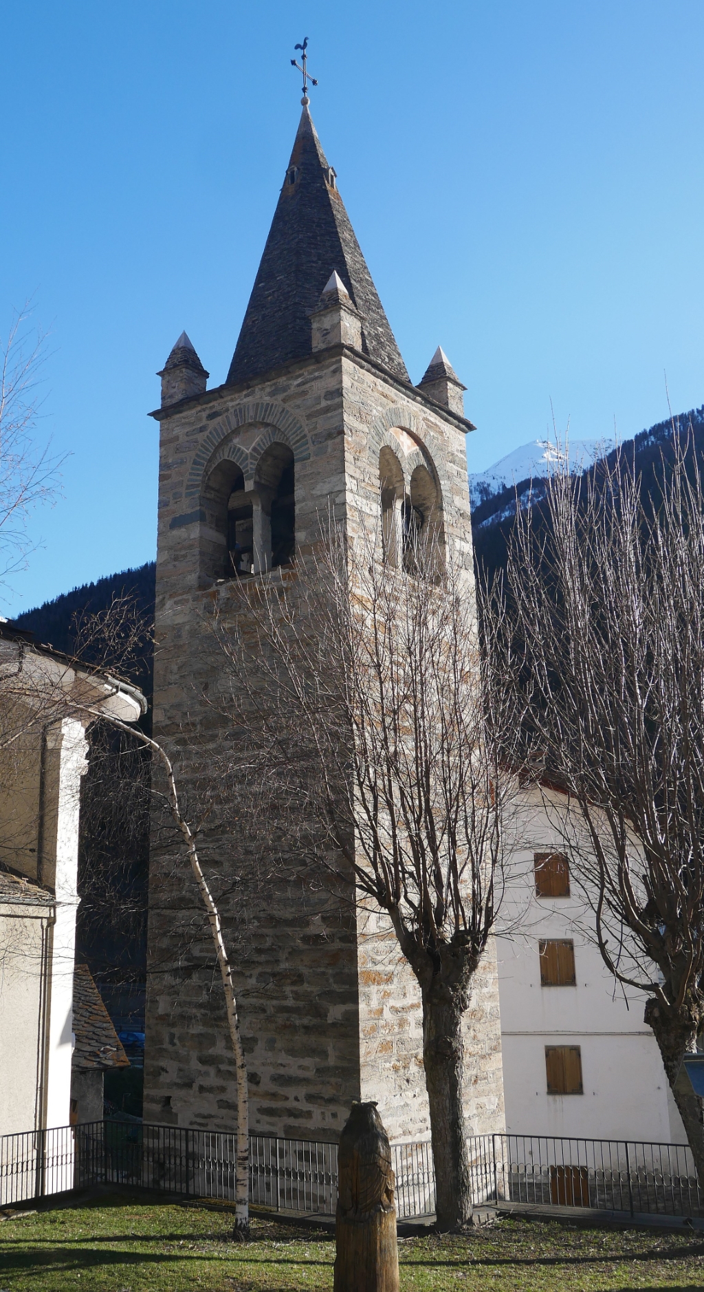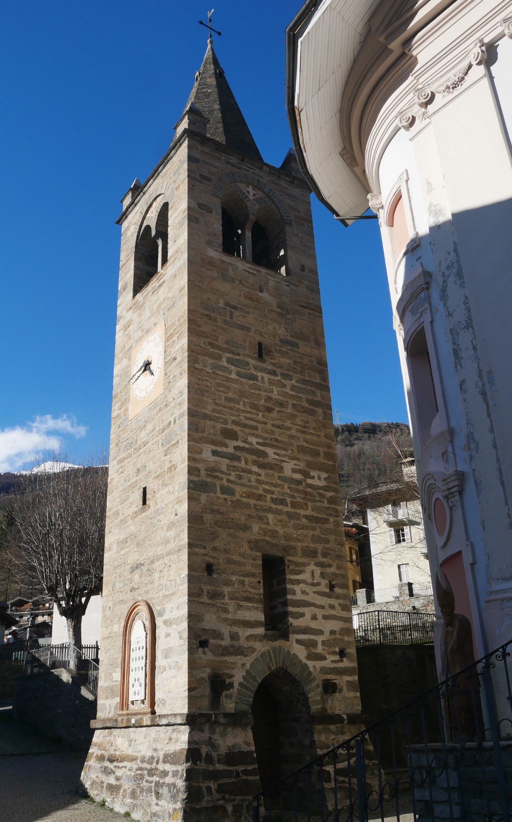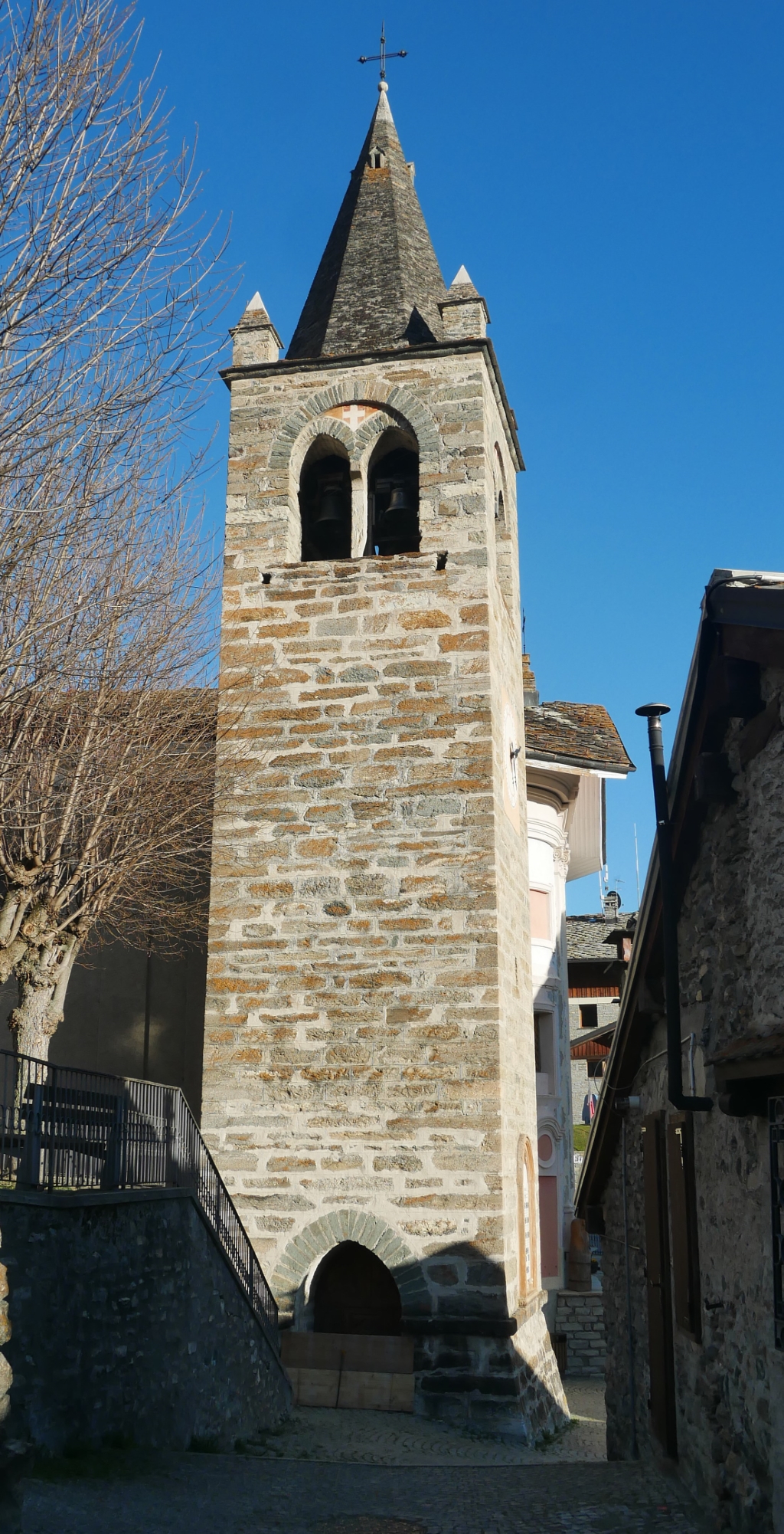 Campanile: separato dalla chiesa, datato 1480 opera di Yolli de Vuetto, costruttore anche di quello di Gignod. |