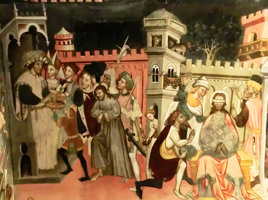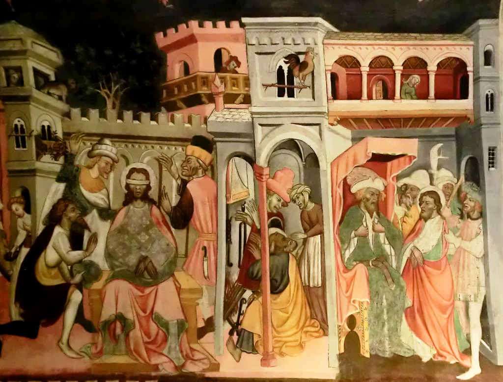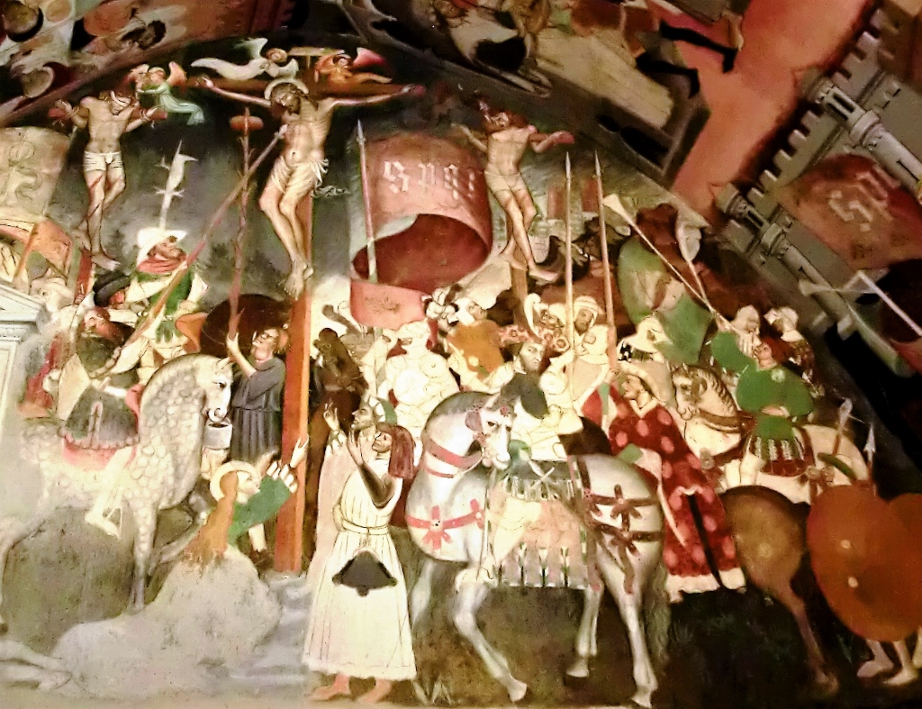Interno: lacerti dipinti sulle pareti laterali e, nel coro, molto ben conservati, una splendida storia della passione dipinta da un ignoto pittore, diverso dall’autore della Sala baronale, che mostra influssi jaqueriani. Di pianta quadrata e di piccole dimensioni, il coro presenta tre lunette con alla base un velario a motivi geometrici, affollate da personaggi e architetture, dipinti con grande attenzione ai particolari e alle espressioni dei volti. Sulla parete di fondo la Crocifissione, nella parte inferiore tagliata da una lapide funebre del 1553; sulle pareti nord e sud, in due registri, le scene della passione si susseguono da sinistra verso destra con, a nord: l’ingresso in Gerusalemme, il tradimento di Giuda e l’ultima Cena, sul registro inferiore, la lavanda dei piedi, la preghiera nell’orto degli ulivi e la cattura. Invece sulla parete sud, in alto, sono raffigurati Cristo davanti a Caifa, il rinnegamento di Pietro, Cristo deriso e poi davanti a Pilato. Sul registro inferiore l’andata al Calvario, in cui si apre la finestra che dà luce all’ambiente |