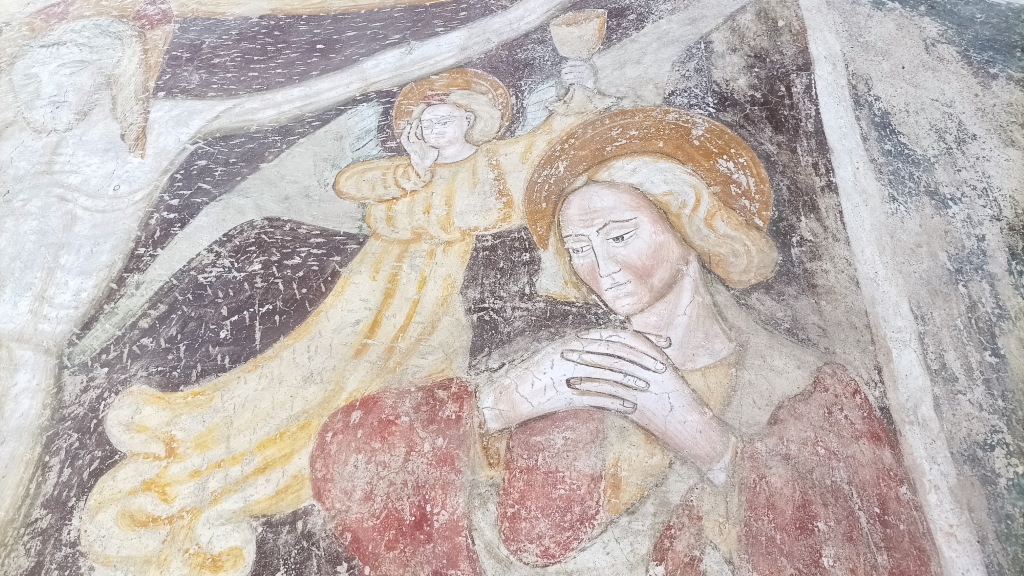 Interno: Crocifissione di fine '400, San Cristoforo e San Fabiano, affreschi attribuiti al pittore Bartolonus. |