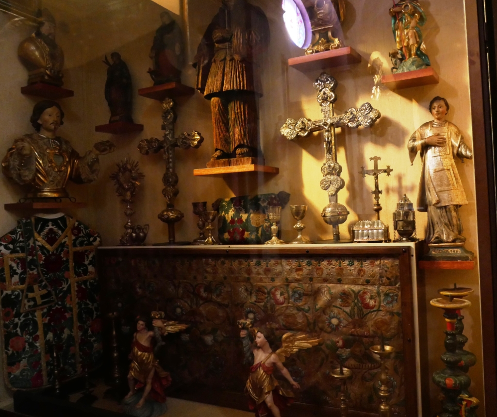 Interno: vasca battesimale in pietra del '400 e reliquiario dello stesso periodo. |