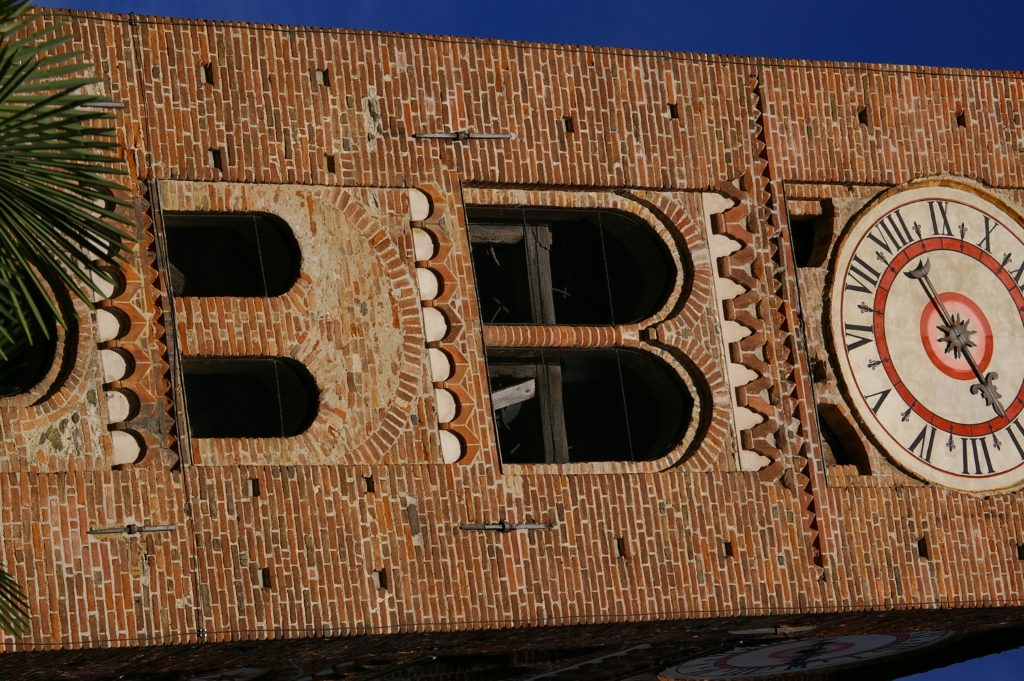 Campanile: romanico a monofore e bifore con fasce marcapiano a dente di sega e archetti pensili in cotto. |