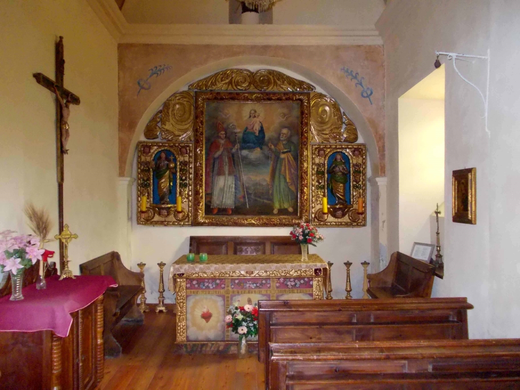 nella parete di fondo retablo barocco, intagliato e dipinto, con tela raffigurante la Madonna col Bambino tra i santi Biagio e Pietro Apostolo. |