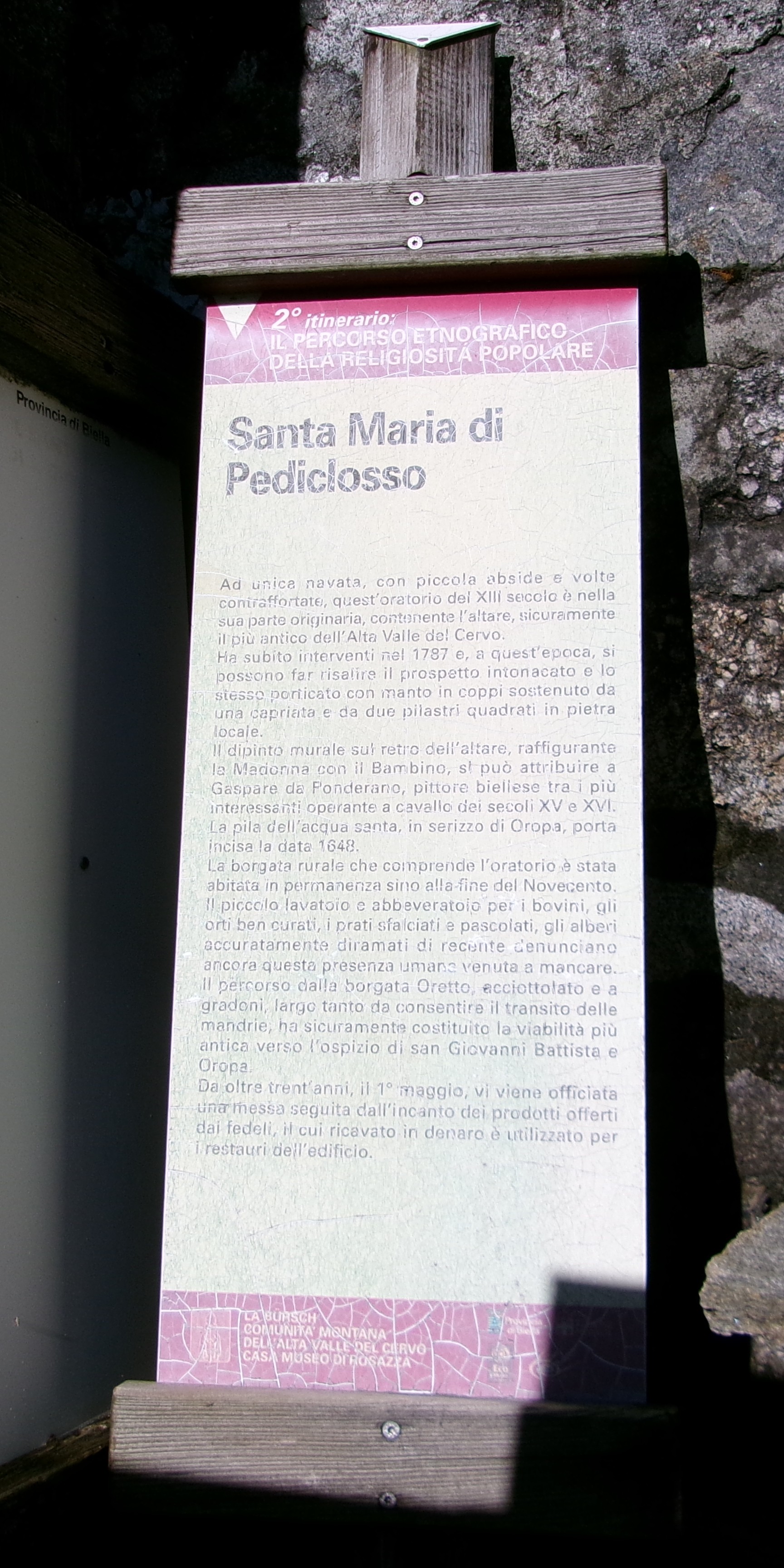 Notizie generali: L’oratorio di Santa Maria di Pediclosso sorge nella frazione Campiglia Cervo, in posizione appartata rispetto al nucleo abitato, lungo l’antico percorso che dalla borgata Oretto risaliva verso l’ospizio di San Giovanni Battista e il santuario di Oropa. |