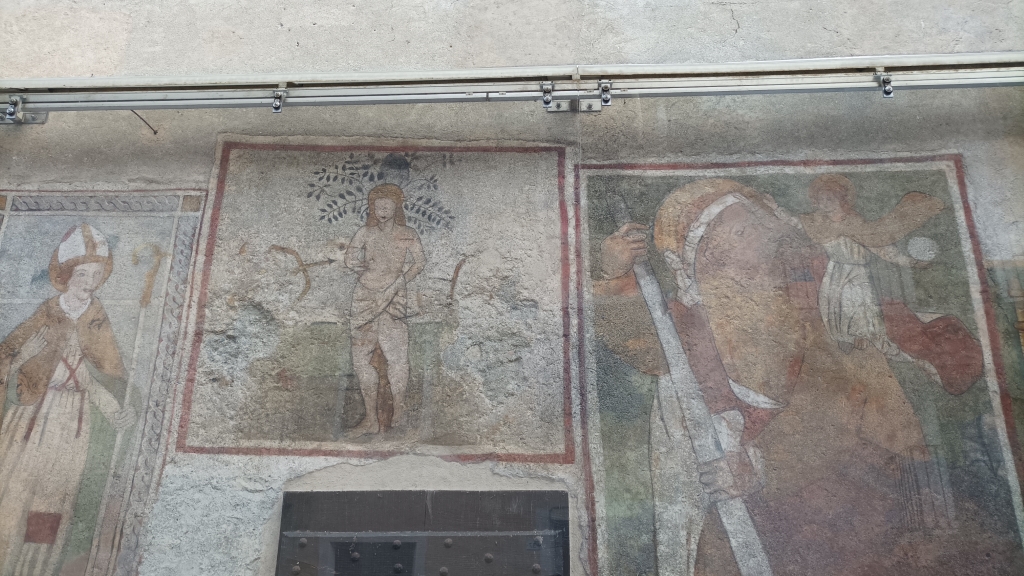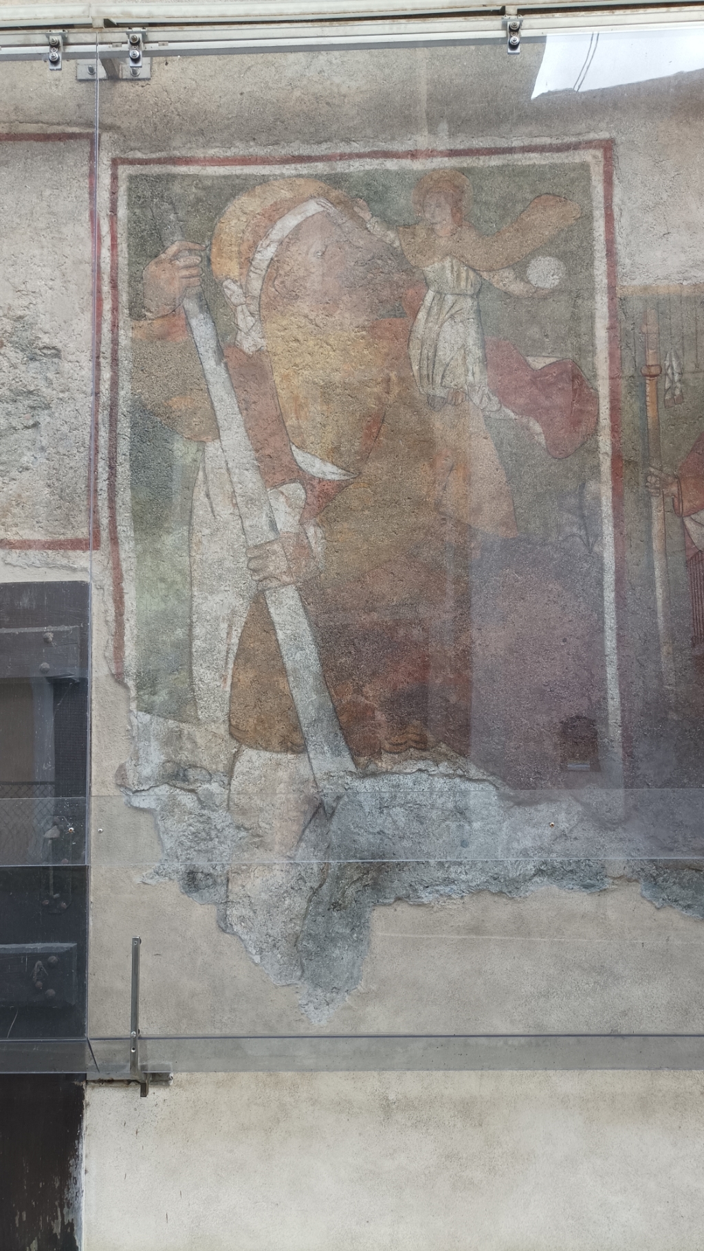 partendo dal lato sinistro dell’affresco, troviamo la raffigurazione di un’ostensione della Sindone: il telo appare disteso completamente, così da porre in evidenza sia la parte anteriore che posteriore del corpo di Cristo; i lati sono sostenuti da due vescovi e al centro da un cardinale che viene riconosciuto in Ludovico di Gorrevod, vescovo di Saint Jean de Maurienne. |