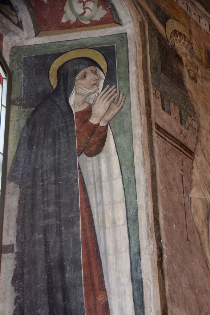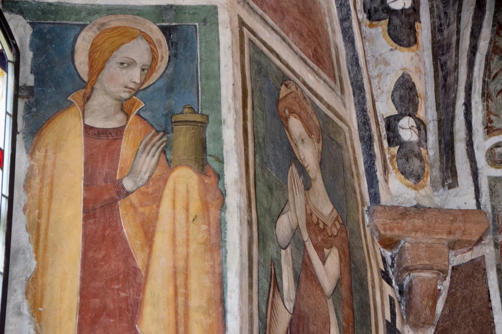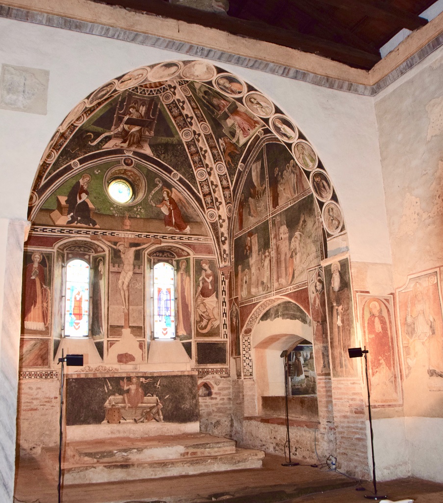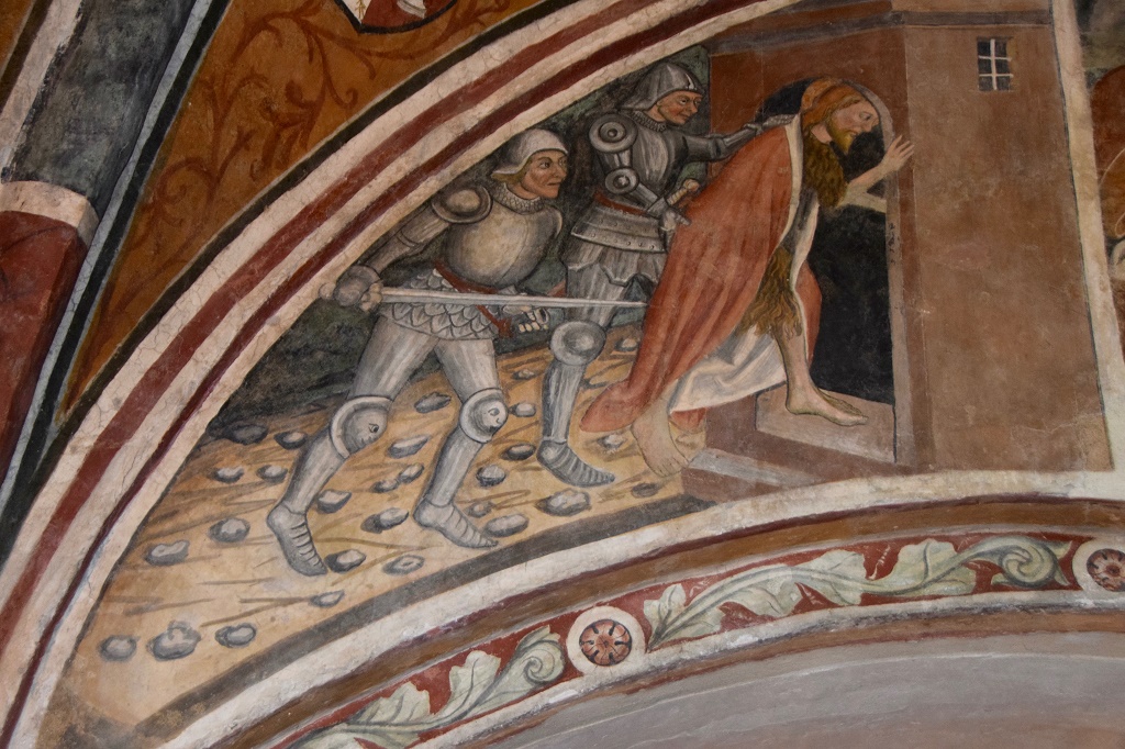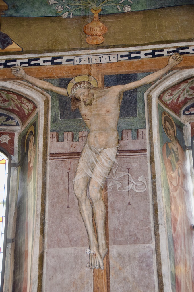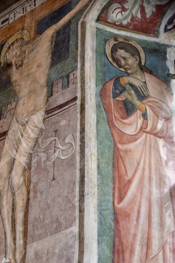 Interno: Originariamente a una navata con abside semicircolare, venne trasformato con l'aggiunta della navate laterali e il rifacimento del presbiterio quadrato. Vi si trovano affreschi del '400 della scuola dello Jaquerio (1375-1453) e forse dello stesso Jaquerio, a lui infatti è, non concordemente sia sulla paternità che sulla data (1440), attribuito il ciclo della Crocifissione del presbiterio con il Cristo in croce, la Madonna, San Giovanni e altre Sante, Santa Caterina d'Alessandria, Santa Lucia, Santa Barbara, Santa Margherita, con i simboli del martirio. Inoltre Storie di San Pietro e di San Giovanni, mentre dovute ad altra mano sono l'Annunciazione e gli Evangelisti. Nella cappella di San Biagio nella navata sinistra affreschi di minor pregio. Nella navata di destra la cappella dei Provana contiene affreschi con Storie della Vita di San Giovanni in cui si riconoscono i simboli della famiglia (il liocorno o i tralci di vite); degni di nota San Giovanni che predica agli animali, Il Battesimo di Gesù, Giovanni che predica a Erode ed Erodiade; sull'altare Madonna in trono da cui affiorano pitture di epoca precedente. |