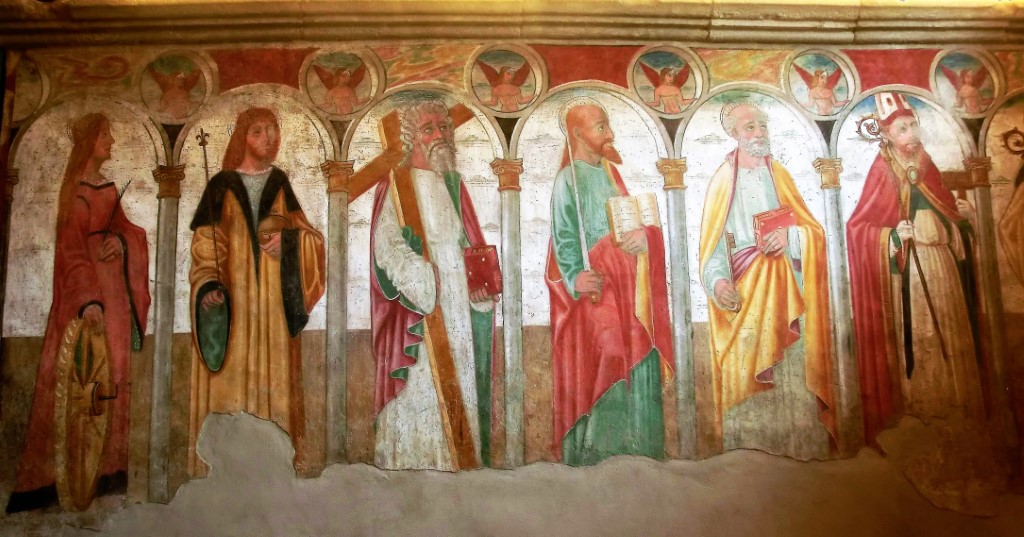Interno: a tre navate divise da colonne e pilastri ottagonali e cruciformi con capitelli cubici reggenti archi, cordonature ogivali e volte a crociera nella navata centrale. Le pareti in mattoni presentano affreschi attribuibili a varie mani databili tra la fine del '400 e l'inizio del '500. Nella navata centrale due acquasantiere su doppie colonnine, forse del X secolo; sul secondo pilastro destro San Cristoforo datato 1497 opera di Franceschino Bosilio (notizie 1481-1507). Nella prima cappella a destra del presbiterio affreschi lombardeggianti della fine del '400; sul pilastro della seconda cappella Giovanni Battista e Madonna col Bambino opera del Bosilio. Nell'abside affreschi tra cui una Madonna col Bambino forse del XII secolo. |