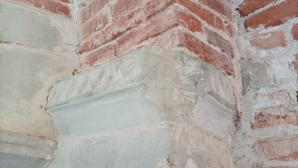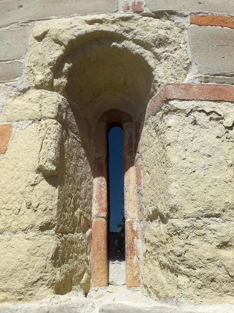 Interno: nella parete nord si vedono le tamponatura delle monofore. I piedritti di raccordo dell'abside hanno capitelli scolpiti, a motivi triangolari quello a sud, e reggono l'arco trionfale di mattoni. |