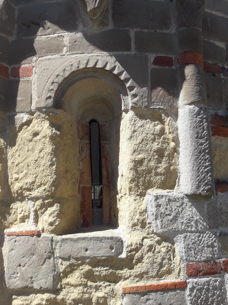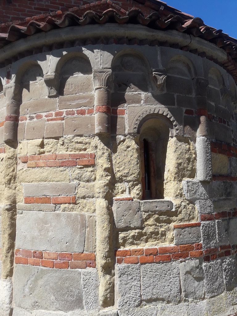Esterno: la facciata è frutto dei restauri del 1791 e del 1959, originali i blocchi di pietra sugli spigoli. La parete sud presenta inferiormente una struttura a ciottoli e mattoni; nella parte mediana mattoni accuratamente disposti a «spina di pesce». In basso a destra si notano tracce di una ammorsatura di muro precedente; la parte alta è di recente costruzione; nella parte terminale di destra si notano tracce di un coronamento laterizio; al centro una porta con arco falcato a conci di arenaria. Un frammento con decorazioni a foglie è inserito nella muratura a sinistra della porta. L'abside è divisa in cinque campi da quattro semi colonne in pietra; al centro del primo e terzo campo si apre una monofora con arco a tutto sesto ricavato in un unico blocco di pietra, a doppio sguancio, come gli stipiti; è coronata da archetti pensili a tutto sesto, due per campo, ciascuno ricavato in un solo blocco e poggiante su mensoline scolpite. Il coronamento è sormontato da una fila di mattoni disposti a «dente di sega» e una cimasa di pietra. La muratura absidale è a grossi blocchi di pietra grigio-azzurra, alternati a file di mattoni. Delle figure inserite dentro gli archetti pensili resta un fiore stilizzato. Il capitello della semi colonna destra della seconda campitura si presenta tronco-conico con scolpite foglie d'acqua; la ghiera dell'arco della monofora del terzo campo è delimitata da un motivo geometrico scolpito; nella quarta campitura la mensolina del fregio è a fogliala parete nord presenta tracce di mattoni disposti «a spina di pesce»; nella muratura si leggono tre monofore tamponate. |