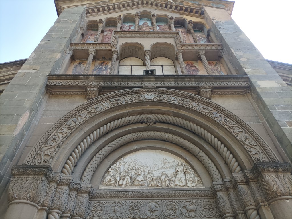 Campanile: forse della metà del XII secolo, poderoso, a monofore, bifore e trifore spartito da cornici di archetti in sette ordini. |