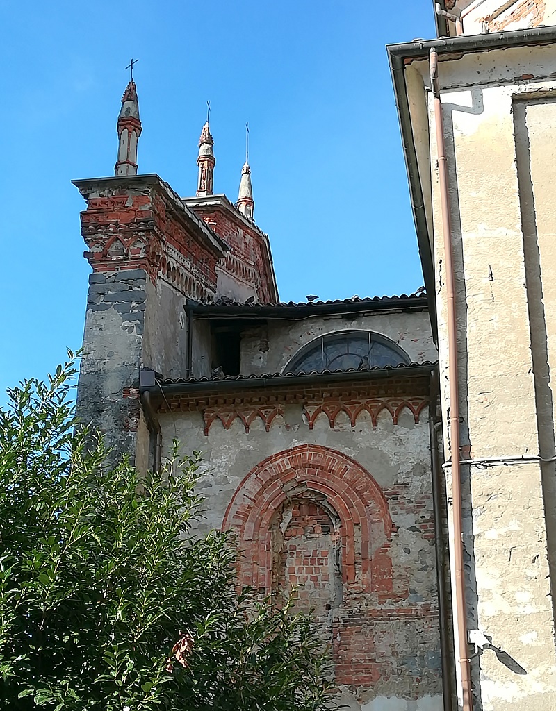 Esterno: l'attuale parte absidale, in stile gotico lombardo, tripartita da lesene che individuano le tre navate, sormontata da pinnacoli e con l'ingresso murato, è di particolare interesse per il rosone, le finestre ogivali e gli archetti gotici a decorazione dello spiovente in cotto smaltato policromo, tipologia piuttosto rara in Piemonte. |