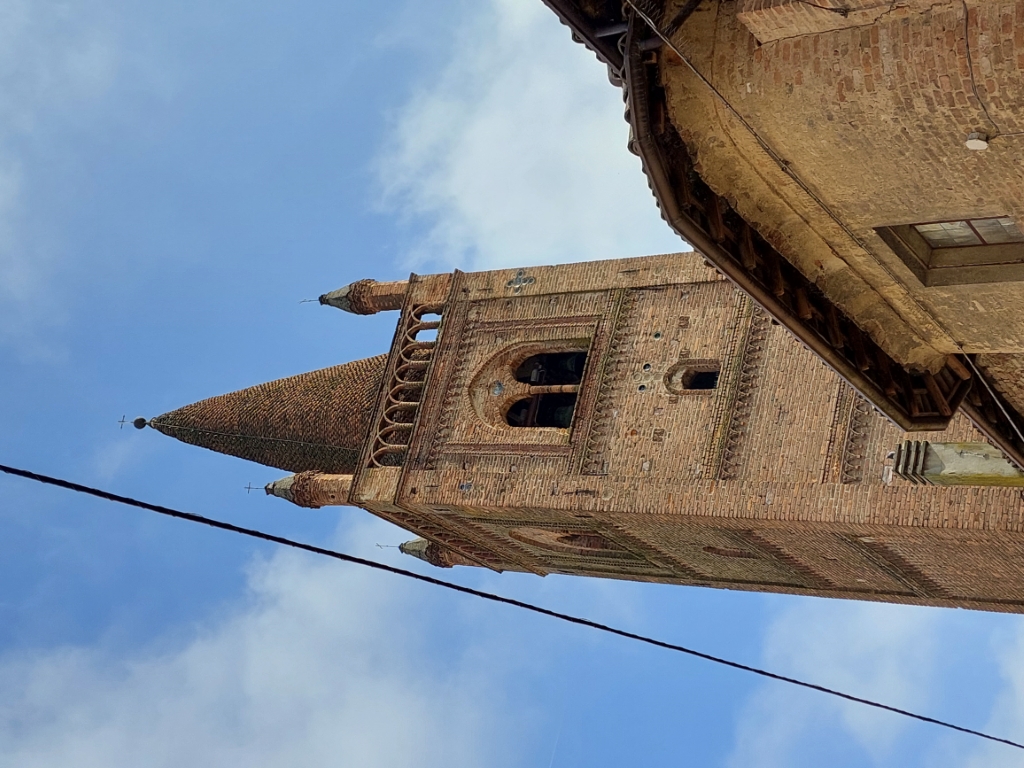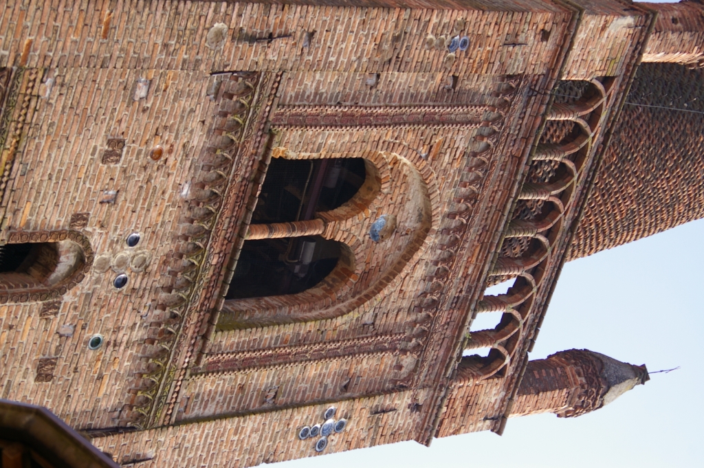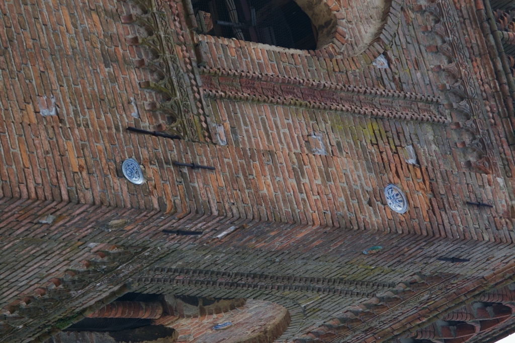 Campanile: gotico in cotto, adattamento di una precedente torre, con formelle in terracotta recanti anche il simbolo del biscione visconteo. |
