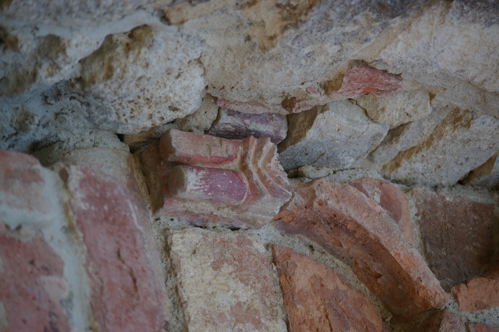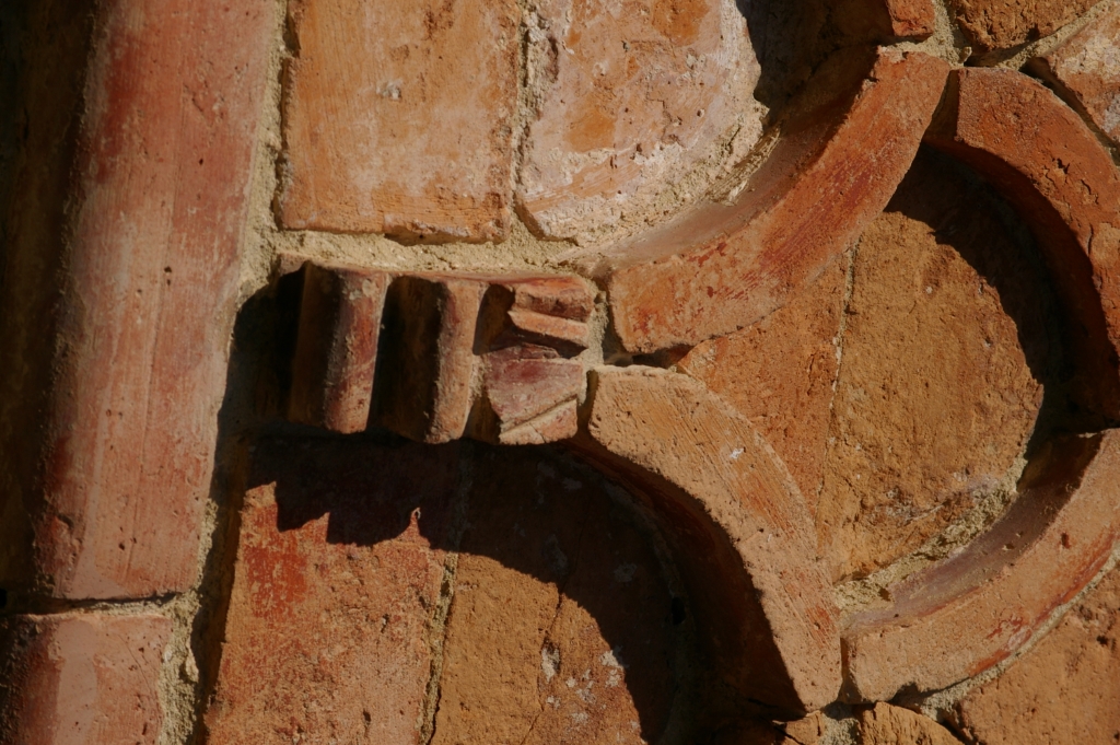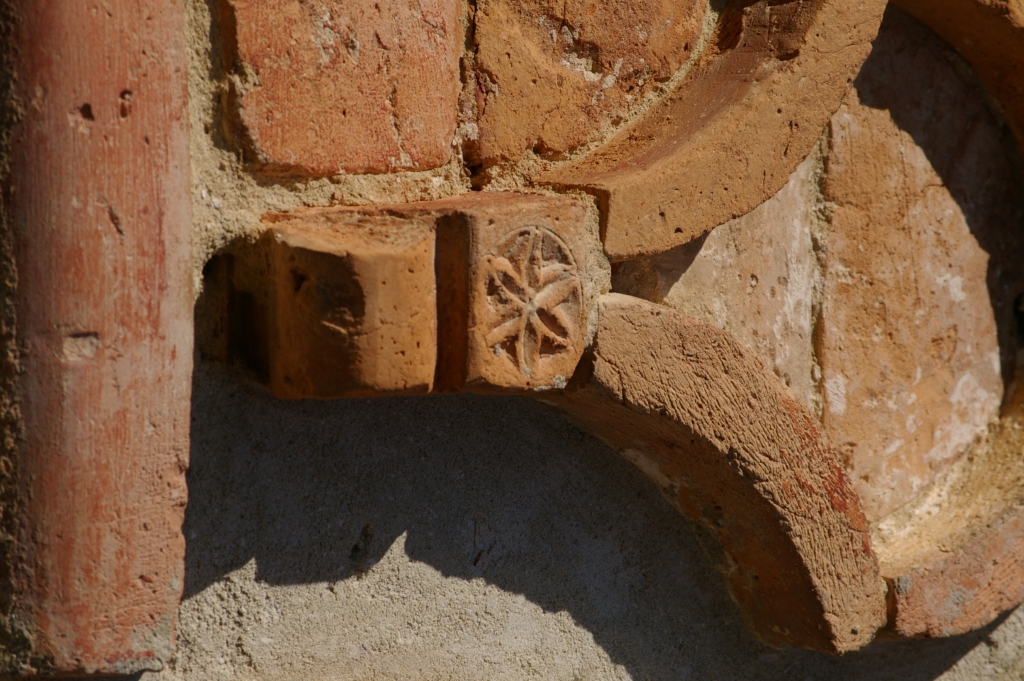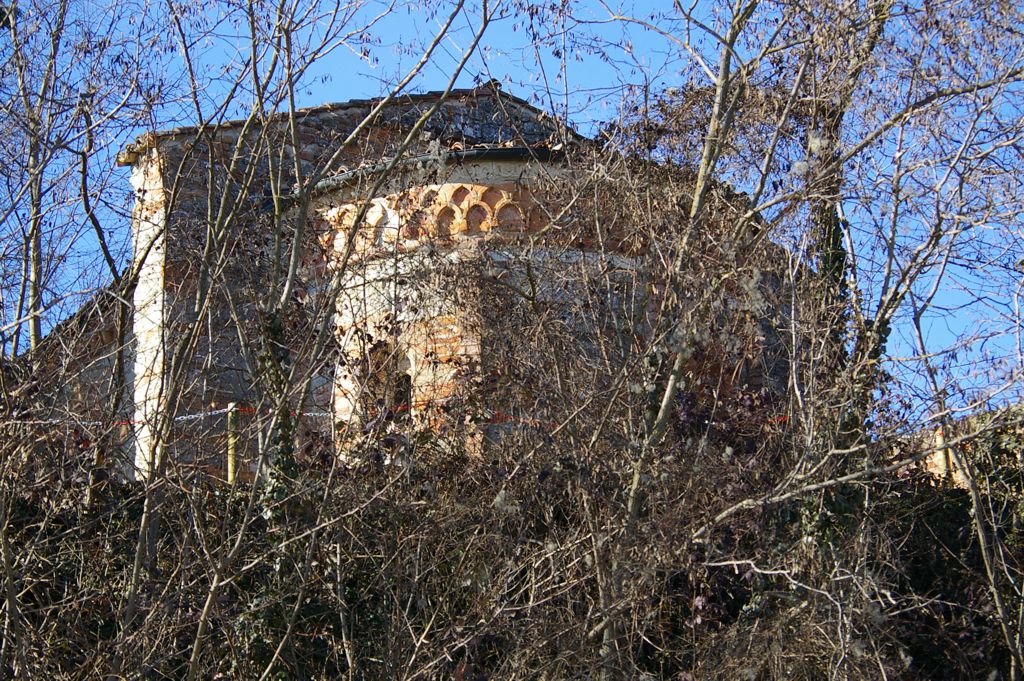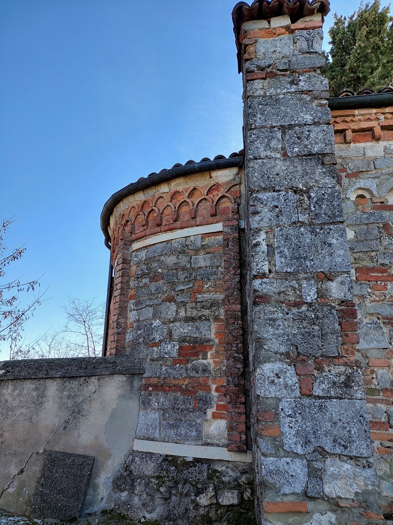 Esterno: abside costruita in mattoni e blocchi di pietra alternati con cornice a doppi archetti pensili. |