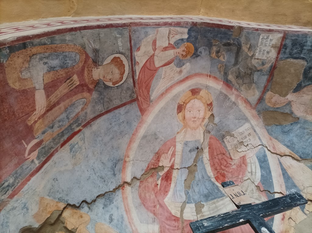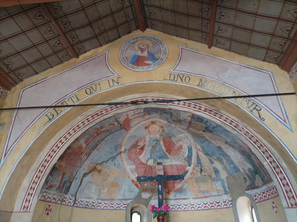 Interno: affreschi del '400 nell'abside con il Cristo in Mandorla con le figure degli Evangelisti e dei due Santi titolari. |