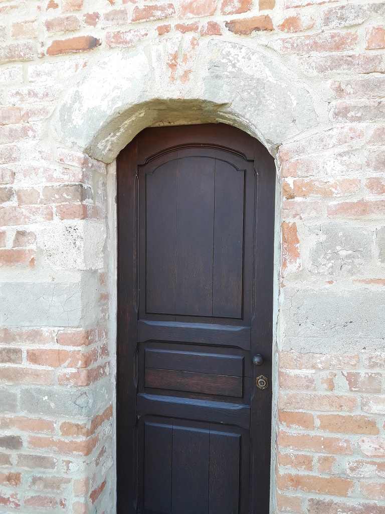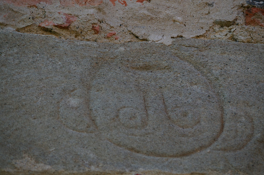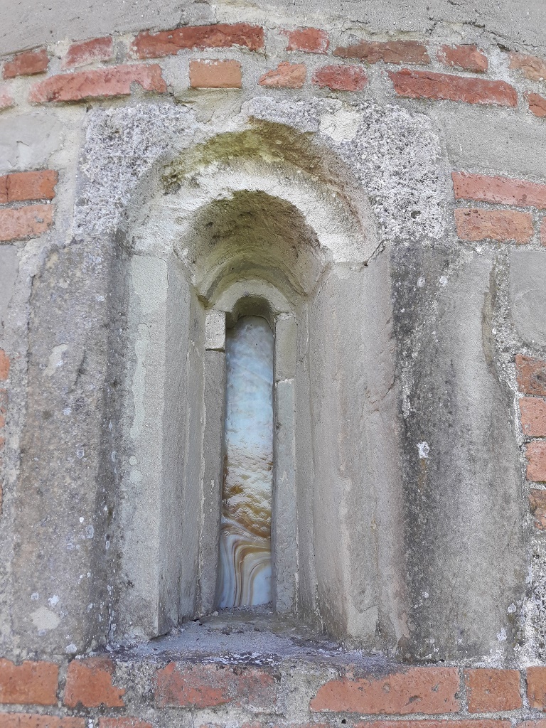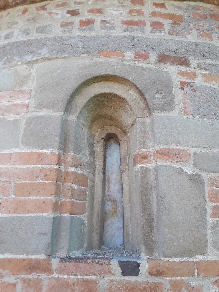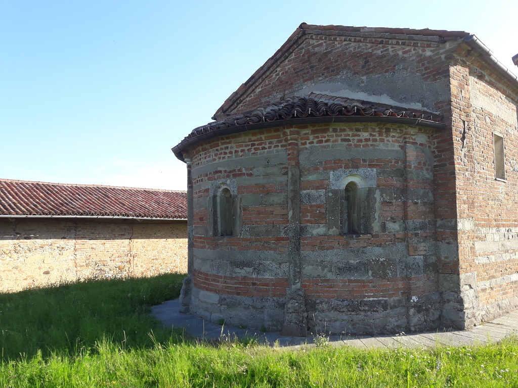 Esterno: a metà della parete sud porta con arco a sesto ribassato e conci in arenaria; in alto a destra della porta è murato un blocco di pietra con incisa una faccia rotonda, capovolta. L'abside si presenta a grossi blocchi di pietra alternati a corsi di mattoni ed è compresa tra due larghe lesene, scandita in tre campi da due esili semi colonnine, inferiormente di pietra, superiormente di mattoni, che poggiano su basi di arenaria. La colonna sud ha un capitello, di recupero, di pietra, quella a nord di mattoni. In ciascun campo una monofora, tamponata, ad arco a tutto sesto con intradossi a riseghe, ricavati in un blocco unico di arenaria bianca; anche gli stipiti, a più riseghe, sono ricavati in un unico blocco, eccetto lo stipite sinistro della prima monofora a sud che è di mattoni. |
