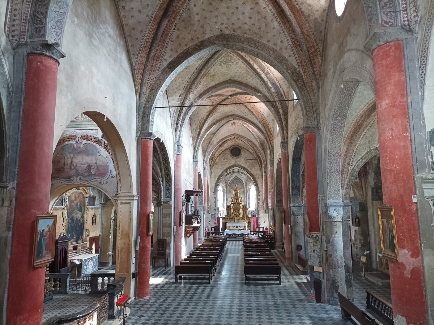 Notizie generali: iniziata nel 1330 e terminata nel 1504 con il compimento dell'abside e della cappella funeraria di Ludovico II, quest'ultima in stile tardo gotico borgognone. La chiesa è sorta sul sito ove esisteva sin dal 1281 una cappella dedicata a San Giovanni; la chiesa orientata verso Ovest venne allungata nel 1370 verso Nord di due campate e assunse l'attuale orientamento pur conservando l'ingresso primitivo; veniva quindi costruito il campanile e nel 1416 lungo il fianco destro il chiostro triangolare di cui non resta che il portale ogivale in via Tapparelli. Nel 1480-87 la parte absidale fu nuovamente allungata oltre la via Tapparelli, scavalcata da un arcone e infine venne costruita la cappella marchionale. |