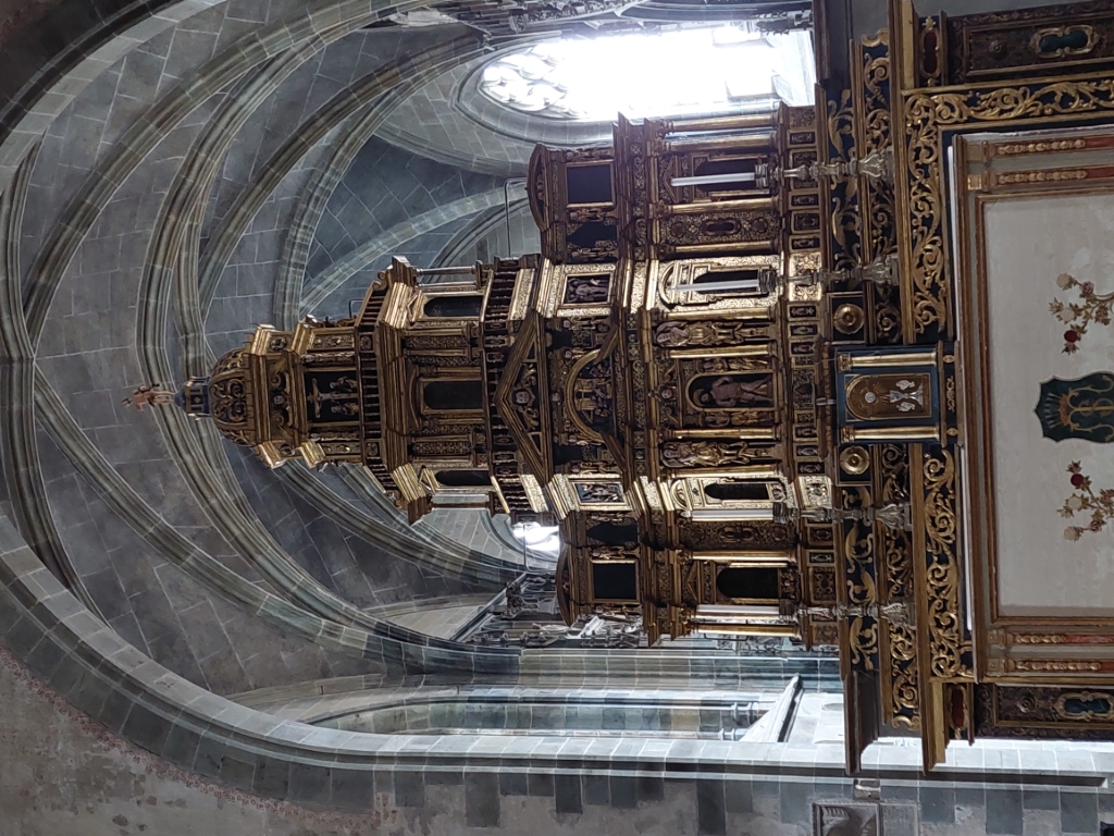 Esterno: gotica facciata disadorna e incompiuta, restaurata nel 1929, ha un portale ogivale con un affresco di imitazione moderna. L'abside il cui autore viene identificato in Antoine Le Moiturier (nato circa 1425, notizie nel 1461-74), fu avviata nel 1474 e terminata nel 1504 dai maestri Anechino Samble e Perineto Zocchelli con i pezzi preparati dal Le Moiturier è costruita con blocchi di pietra squadrati e sorge su un alto basamento caratterizzato da solidi contrafforti tra cui si aprono grandi finestre a sesto acuto; lungo i lati obliqui del semi ottagono vi sono due torricelle aperte da monofore che corrispondono a due cellette interne; in alto corre un coronamento. |