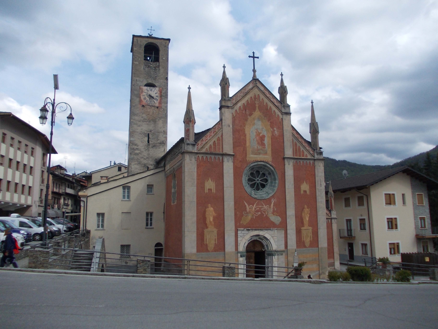 Esterno: di impianto gotico, presenta un portale principale in blocchi alternati di marmo bianco e di pietra verde locale con motivi decorativi tipici dell'area alpina. In facciata è anche presente un rosone in pietra verde. Sul lato Nord un secondo portale in marmo bianco datato 1462. |
