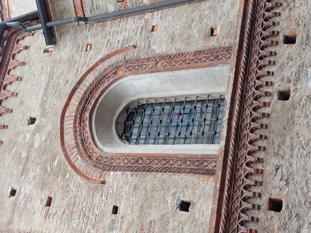 Esterno: abside ornata da monofore e fasce di archetti e affresco della madonna col Bambino entro una Monofora chiusa |
