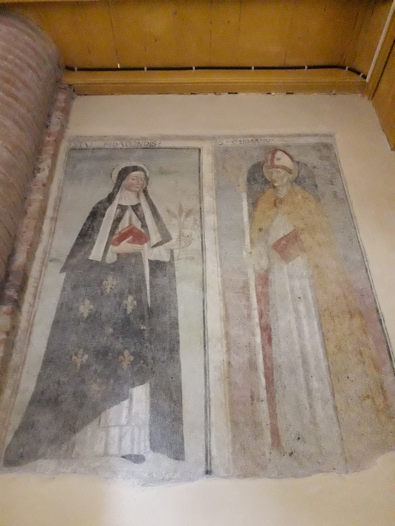 Interno: a cinque navate di cui la centrale su pilastri cruciformi e le estreme su pilastri alternati a colonne, con slanciate volte a crociera cordonate poggianti su archi ogivali. All'entrata tracce di affreschi, a destra Santa Redegonda e San Germano della fine dl '400,; a sinistra Madonna col Bambino della fine del '400 attribuita al Maestro di Cercenasco (attivo dopo il 1475); nella parte destra del presbiterio Deposizione della fine del '400. |