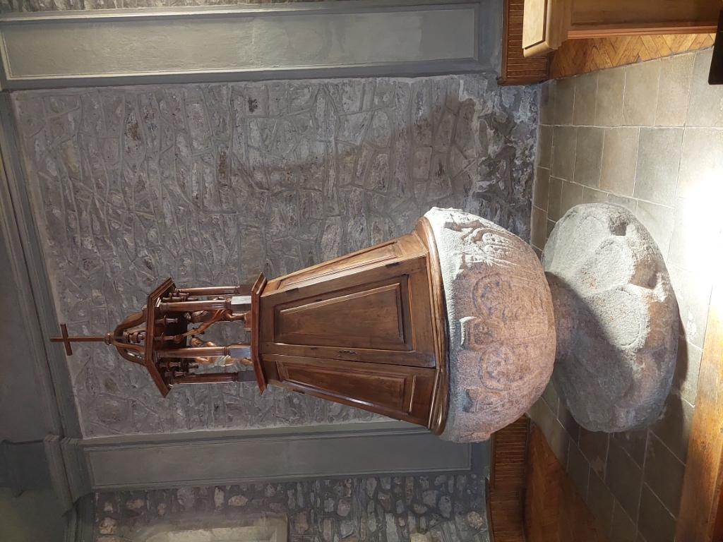 Interno: a tre navate con vasca battesimale di pietra verde di Foresto e arredi: pulpito del 1676 e altari lignei della scuola del Melezet. |