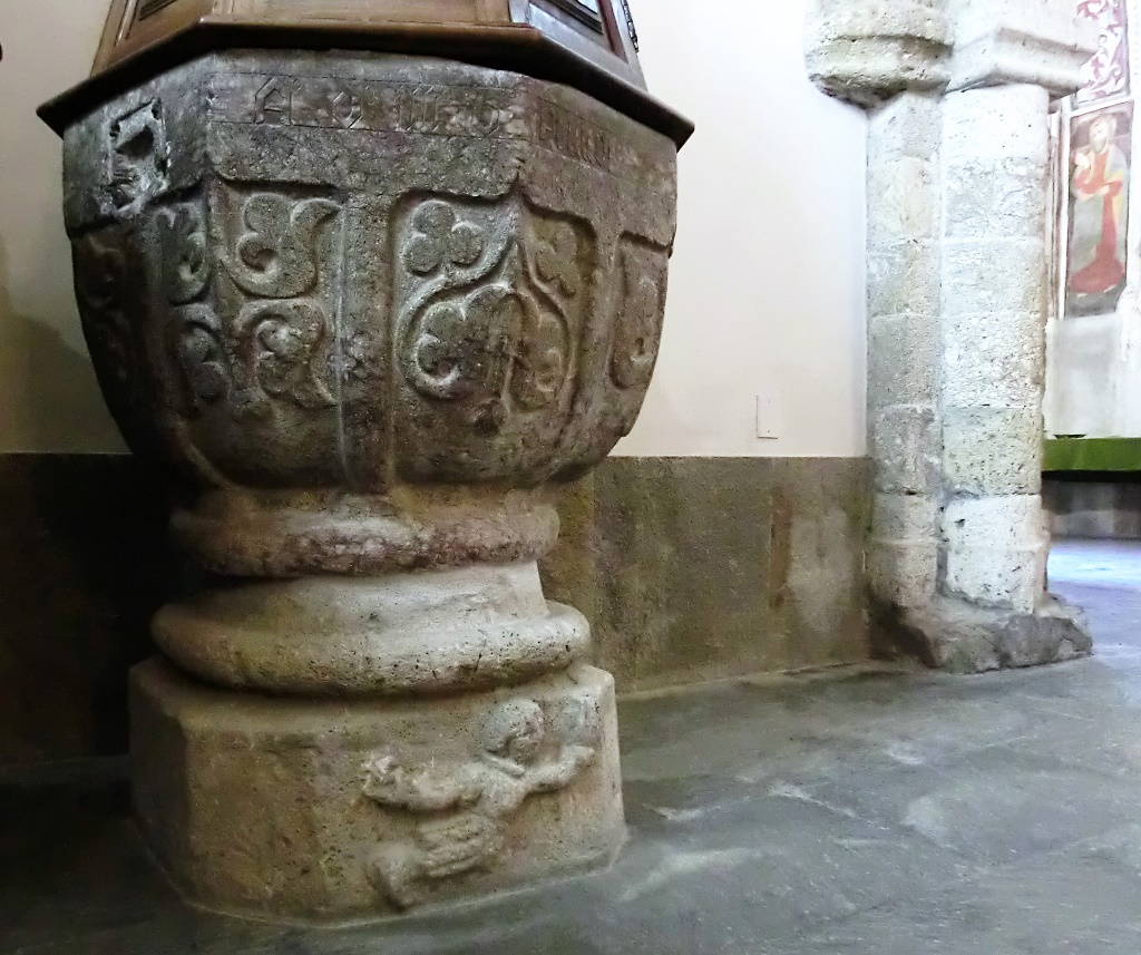 Interno: nell' abside affreschi del XV secolo, vasca battesimale del 1501. |