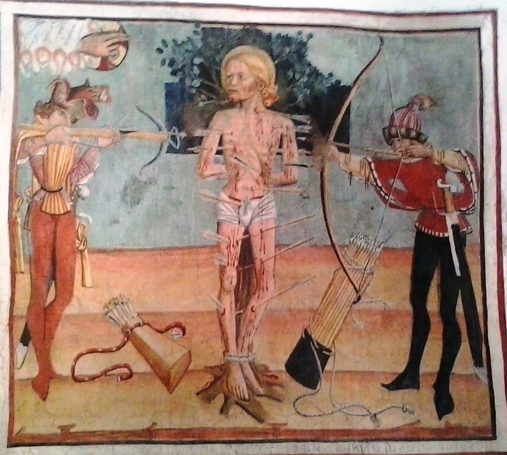 Interno: affreschi (XV secolo) narranti la storia di Papa Sisto e del suo diacono Lorenzo, in 12 riquadri con Annunciazione, martirio di San Sebastiano e San Cristoforo, protettore dei viandanti. |