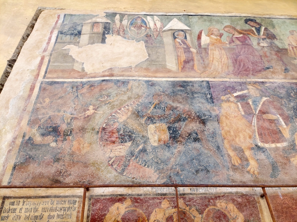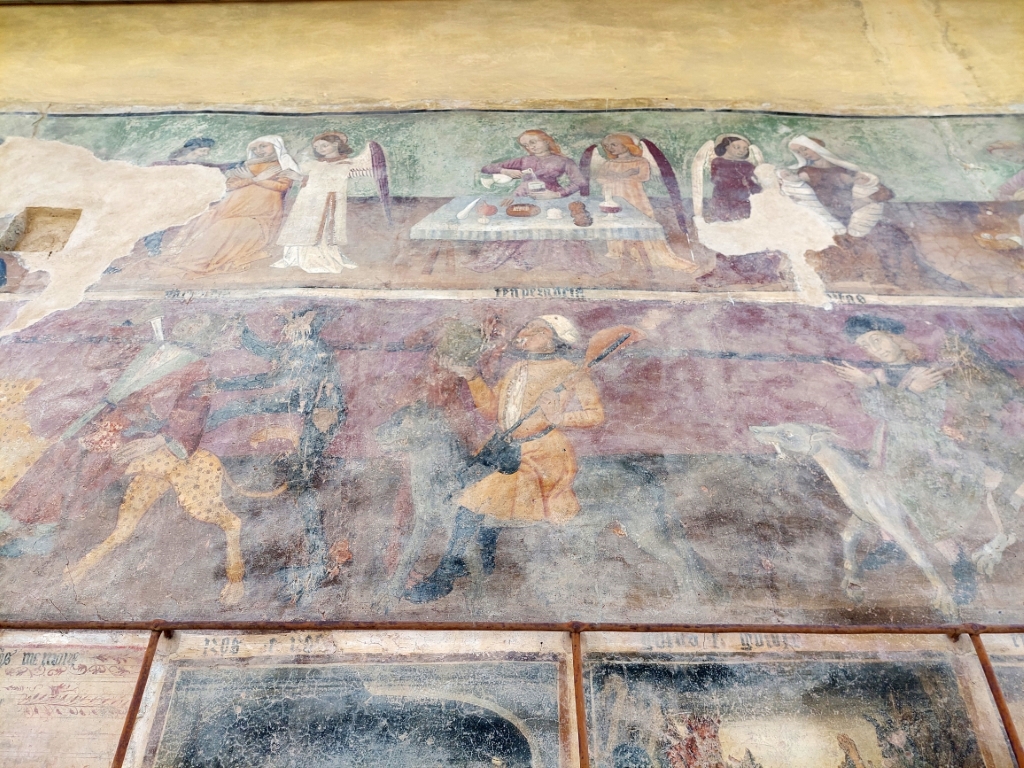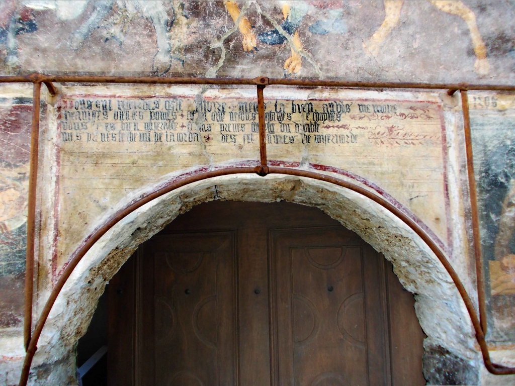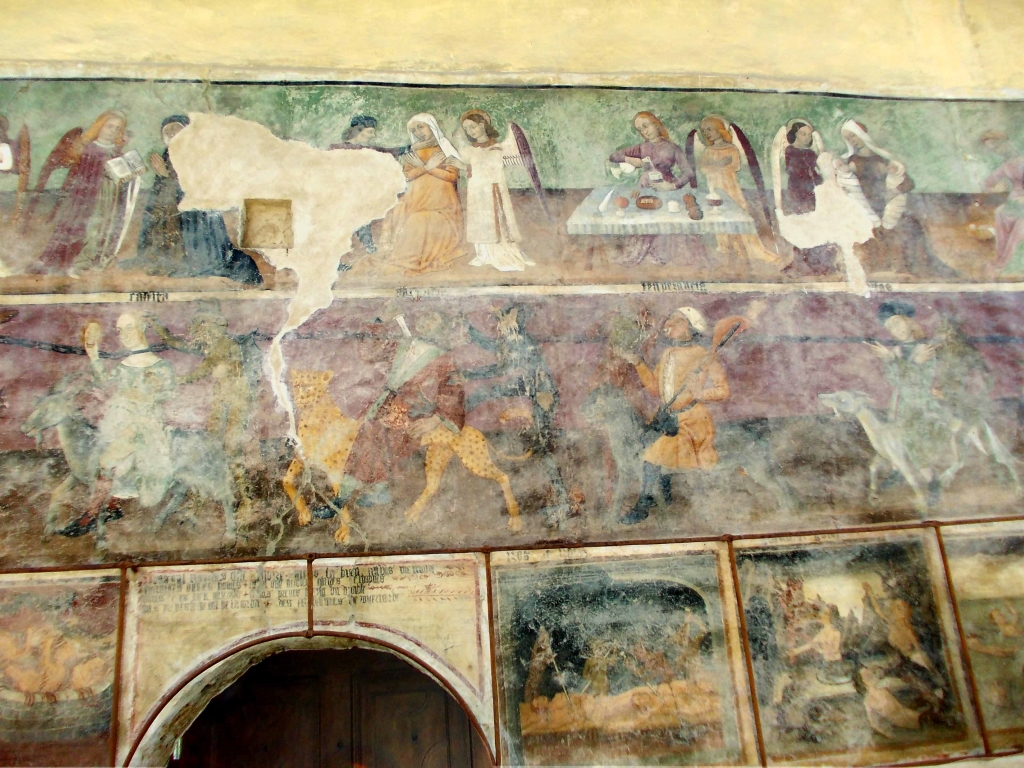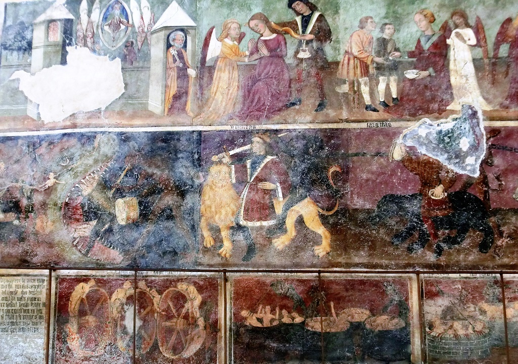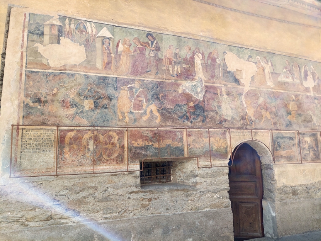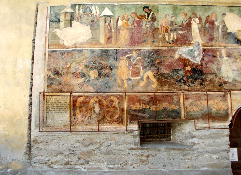 Esterno: sulla parete esterna, prospiciente la strada, affresco tardogotico (XV secolo) rappresentante il tema "I vizi, le virtù e le pene dell'inferno". L'opera si svolge su tre registri: il superiore è dedicato alle virtù, rappresentate da figure femminili ognuna assistita dall'angelo custode, che si presentano a San Pietro (da sinistra: Umiltà, Generosità, Castità, Pazienza, Temperanza, Carità e Diligenza). Nel registro mediano, sotto ogni virtù, è rappresentato il vizio contrario mediante uomini e donne cavalcanti animali e pungolati da diavoli che avanzano verso l'inferno rappresentato dalle fauci di un mostro (da sinistra: Orgoglio, Avarizia, Lussuria, Collera, Gola, Invidia e Accidia). Il registro inferiore descrive le pene dell'inferno a cui verranno condannati i peccatori. |