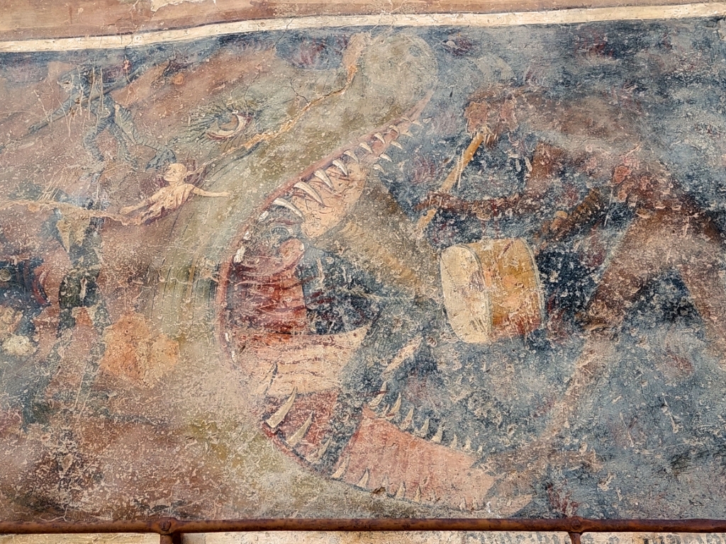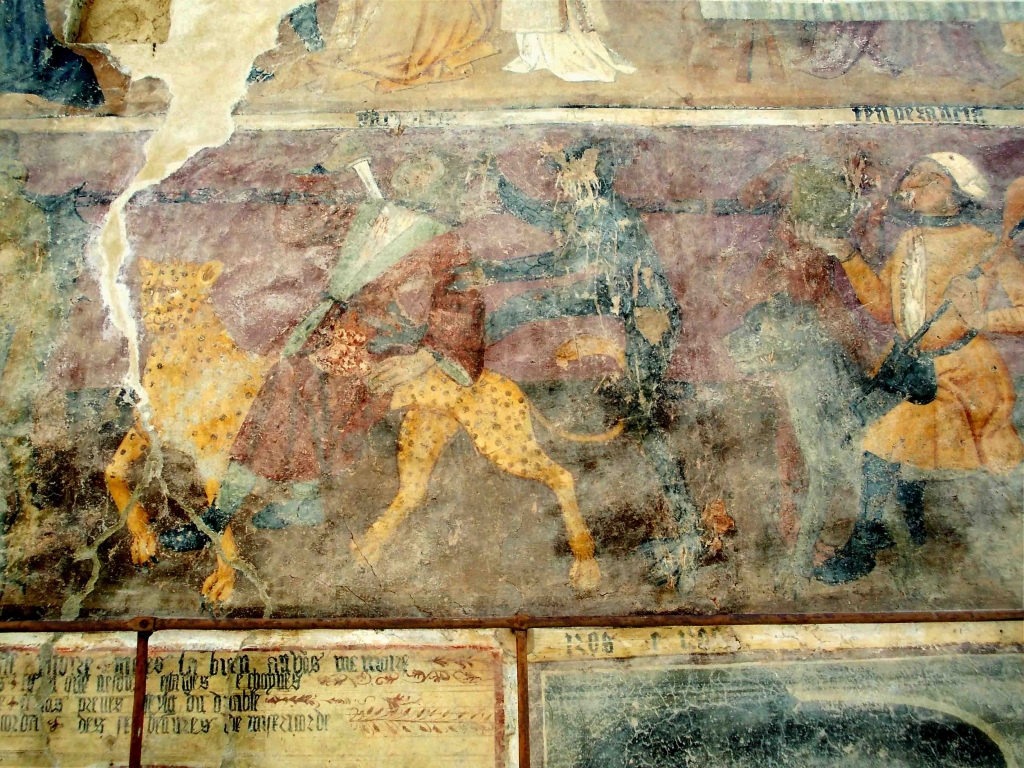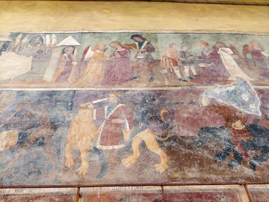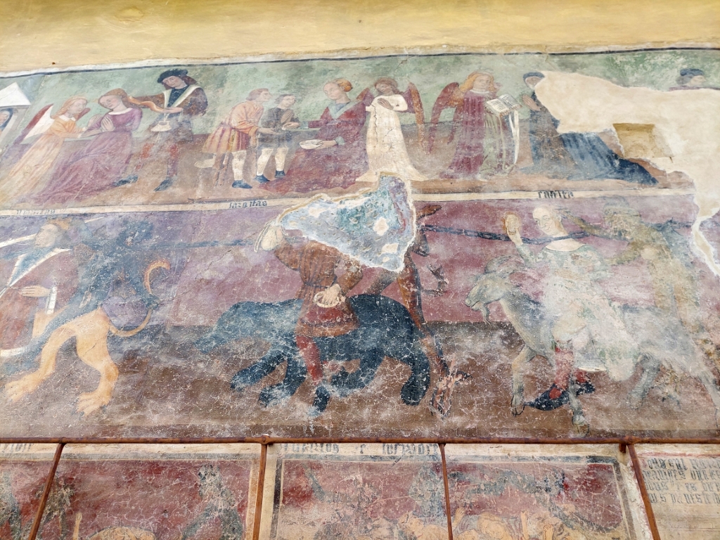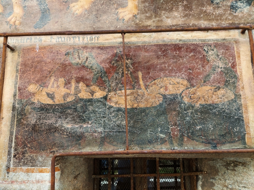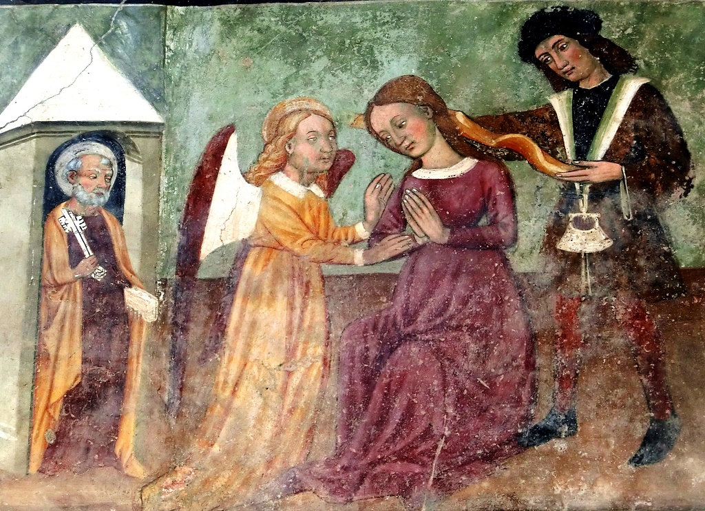 Esterno: sulla parete esterna, prospiciente la strada, affresco tardogotico (XV secolo) rappresentante il tema "I vizi, le virtù e le pene dell'inferno". L'opera si svolge su tre registri: il superiore è dedicato alle virtù, rappresentate da figure femminili ognuna assistita dall'angelo custode, che si presentano a San Pietro (da sinistra: Umiltà, Generosità, Castità, Pazienza, Temperanza, Carità e Diligenza). Nel registro mediano, sotto ogni virtù, è rappresentato il vizio contrario mediante uomini e donne cavalcanti animali e pungolati da diavoli che avanzano verso l'inferno rappresentato dalle fauci di un mostro (da sinistra: Orgoglio, Avarizia, Lussuria, Collera, Gola, Invidia e Accidia). Il registro inferiore descrive le pene dell'inferno a cui verranno condannati i peccatori. |