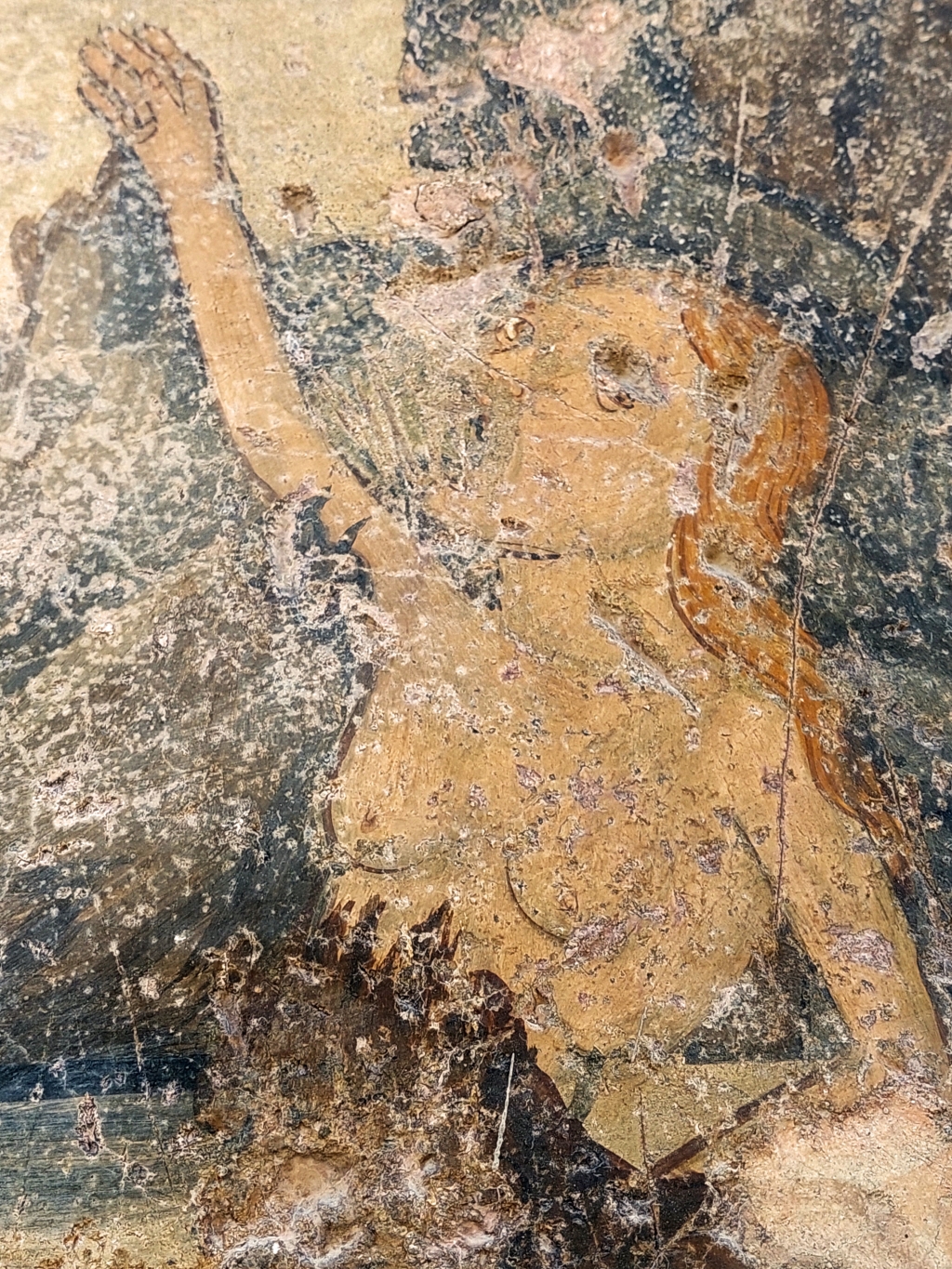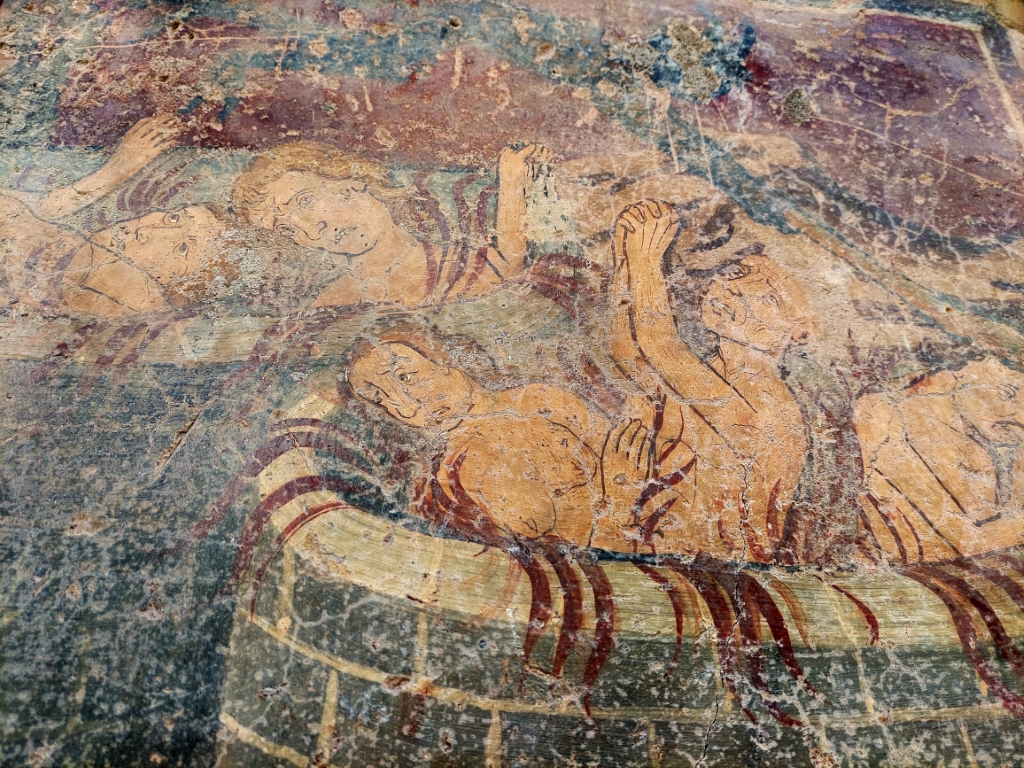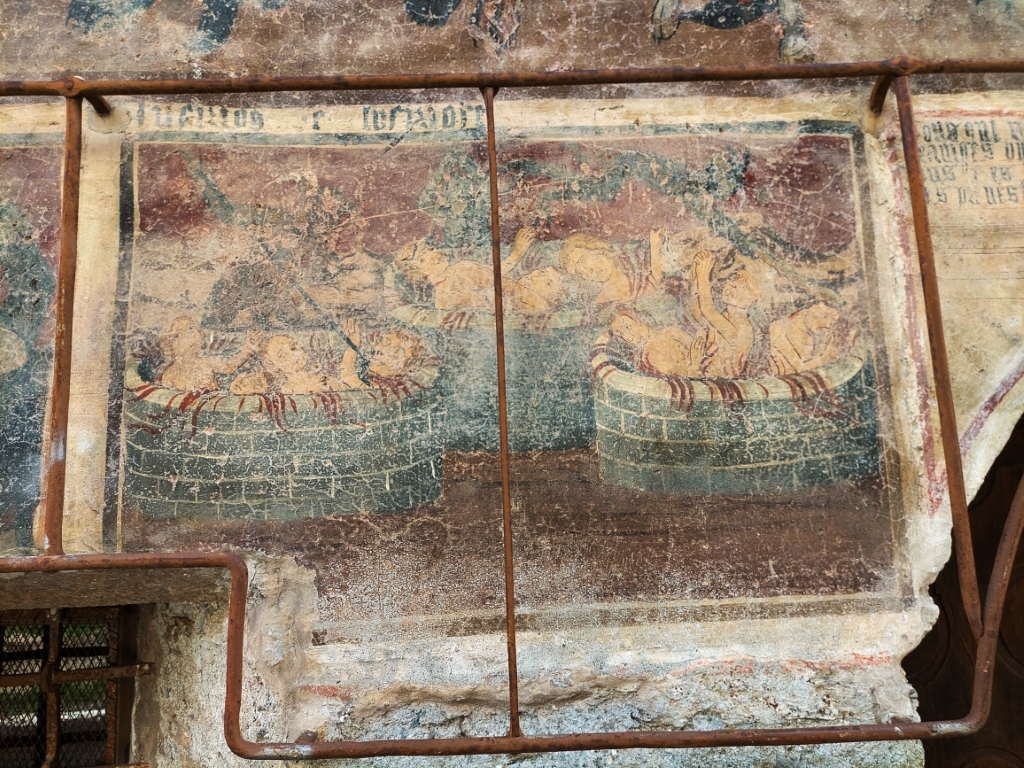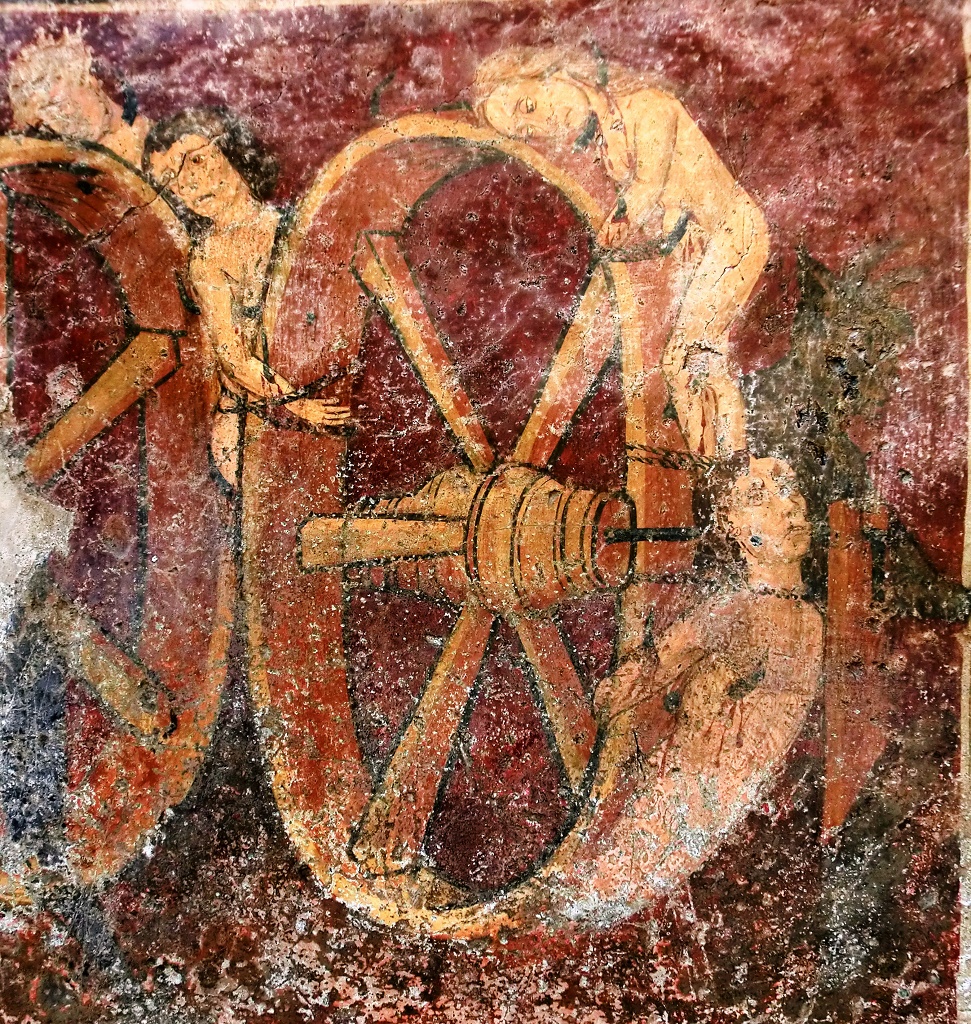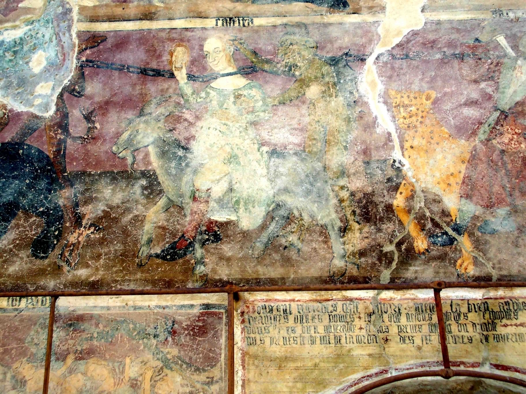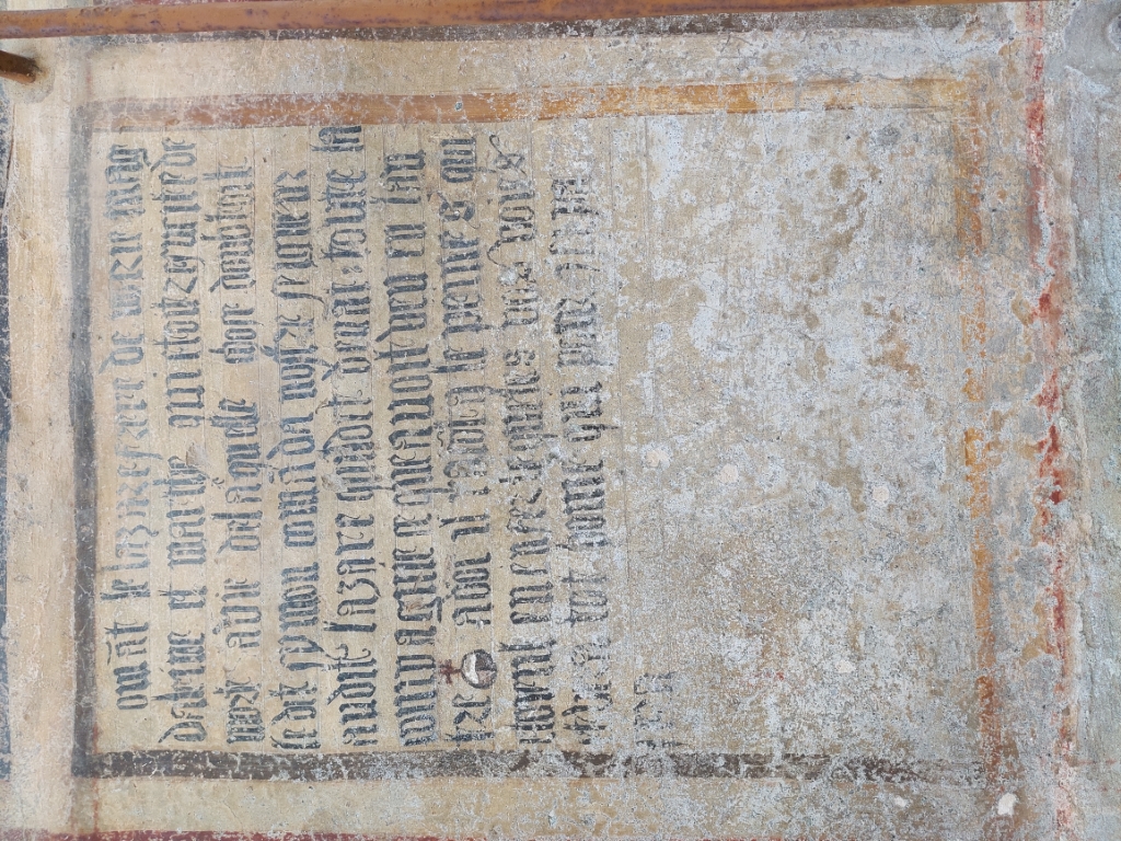 Esterno: sulla parete esterna, prospiciente la strada, affresco tardogotico (XV secolo) rappresentante il tema "I vizi, le virtù e le pene dell'inferno". L'opera si svolge su tre registri: il superiore è dedicato alle virtù, rappresentate da figure femminili ognuna assistita dall'angelo custode, che si presentano a San Pietro (da sinistra: Umiltà, Generosità, Castità, Pazienza, Temperanza, Carità e Diligenza). Nel registro mediano, sotto ogni virtù, è rappresentato il vizio contrario mediante uomini e donne cavalcanti animali e pungolati da diavoli che avanzano verso l'inferno rappresentato dalle fauci di un mostro (da sinistra: Orgoglio, Avarizia, Lussuria, Collera, Gola, Invidia e Accidia). Il registro inferiore descrive le pene dell'inferno a cui verranno condannati i peccatori. |