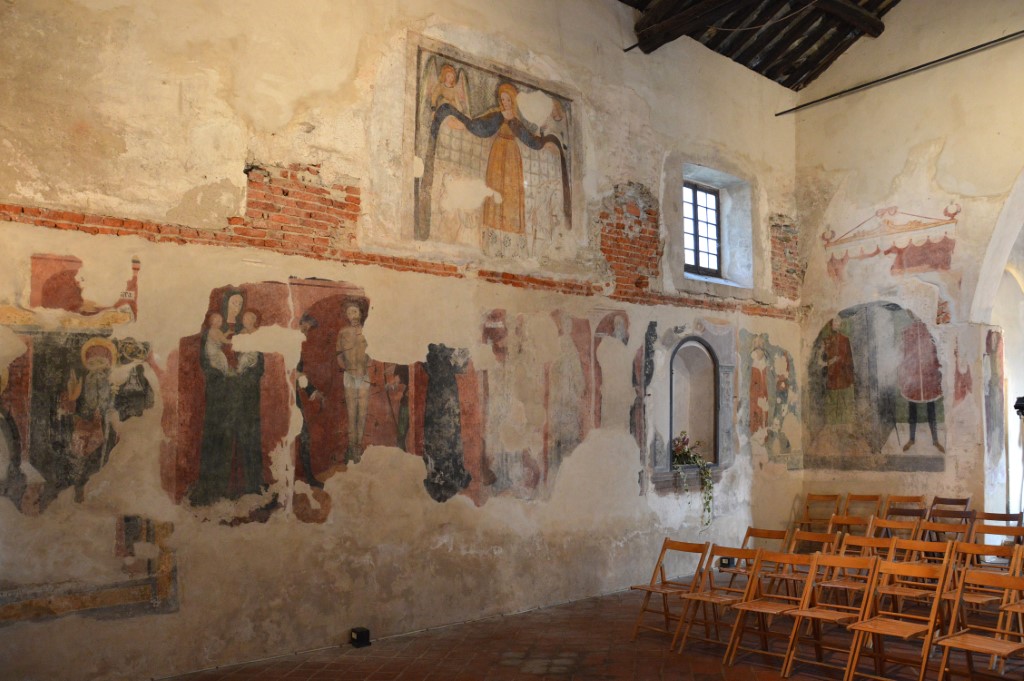 Interno: pareti e volta a croce sono coperte di affreschi del '400 di artista probabilmente lombardo della prima metà del '400 e rappresentano il Padre Eterno, la Pietà, gli Evangelisti, i Dottori della Chiesa e Santi: Santa Apollonia con la palma del martirio, San Bernardina da Siena con ai piedi le tre mitre vescovili rifiutate; una Madonna del latte di schema bizantino con angeli musicanti. |